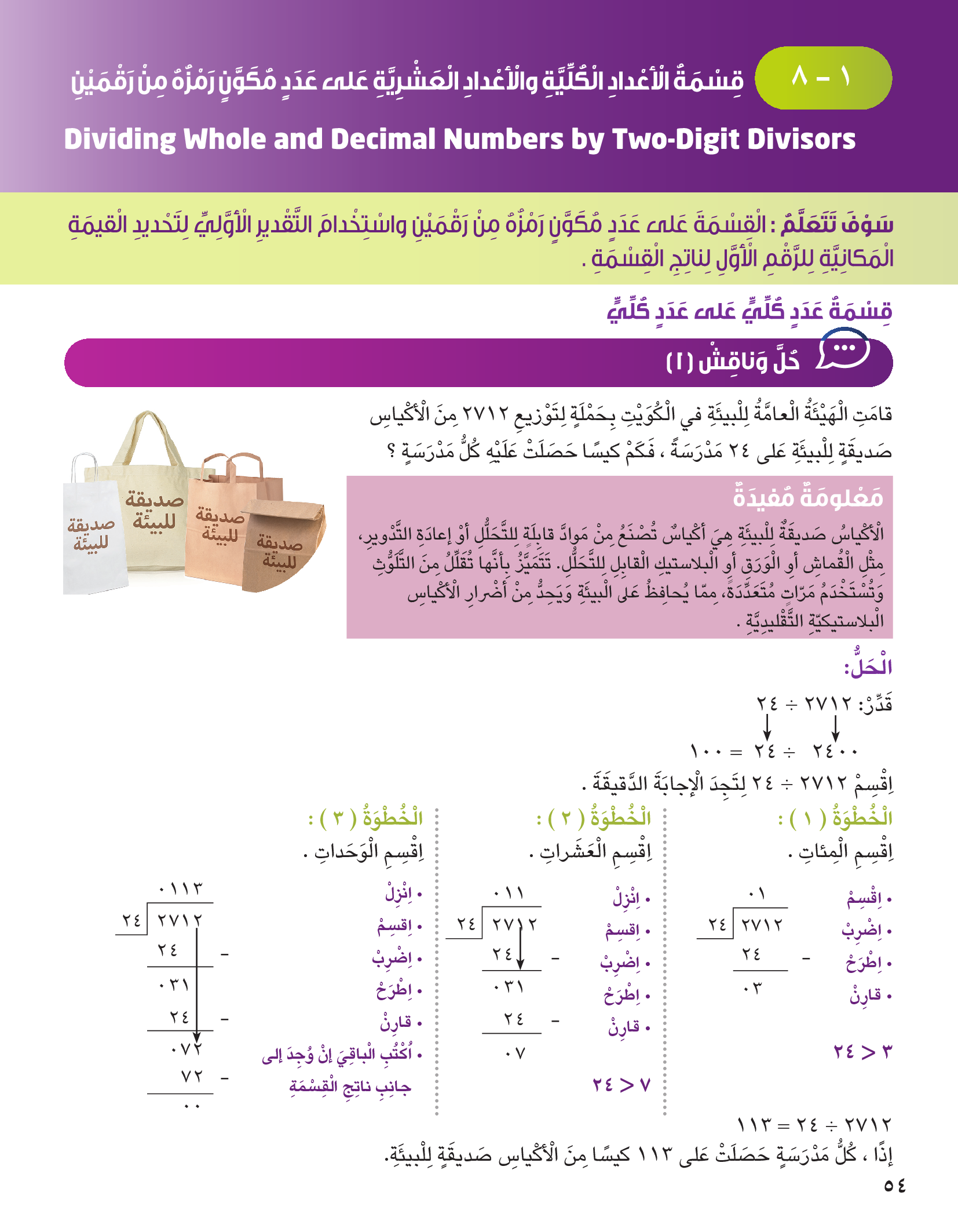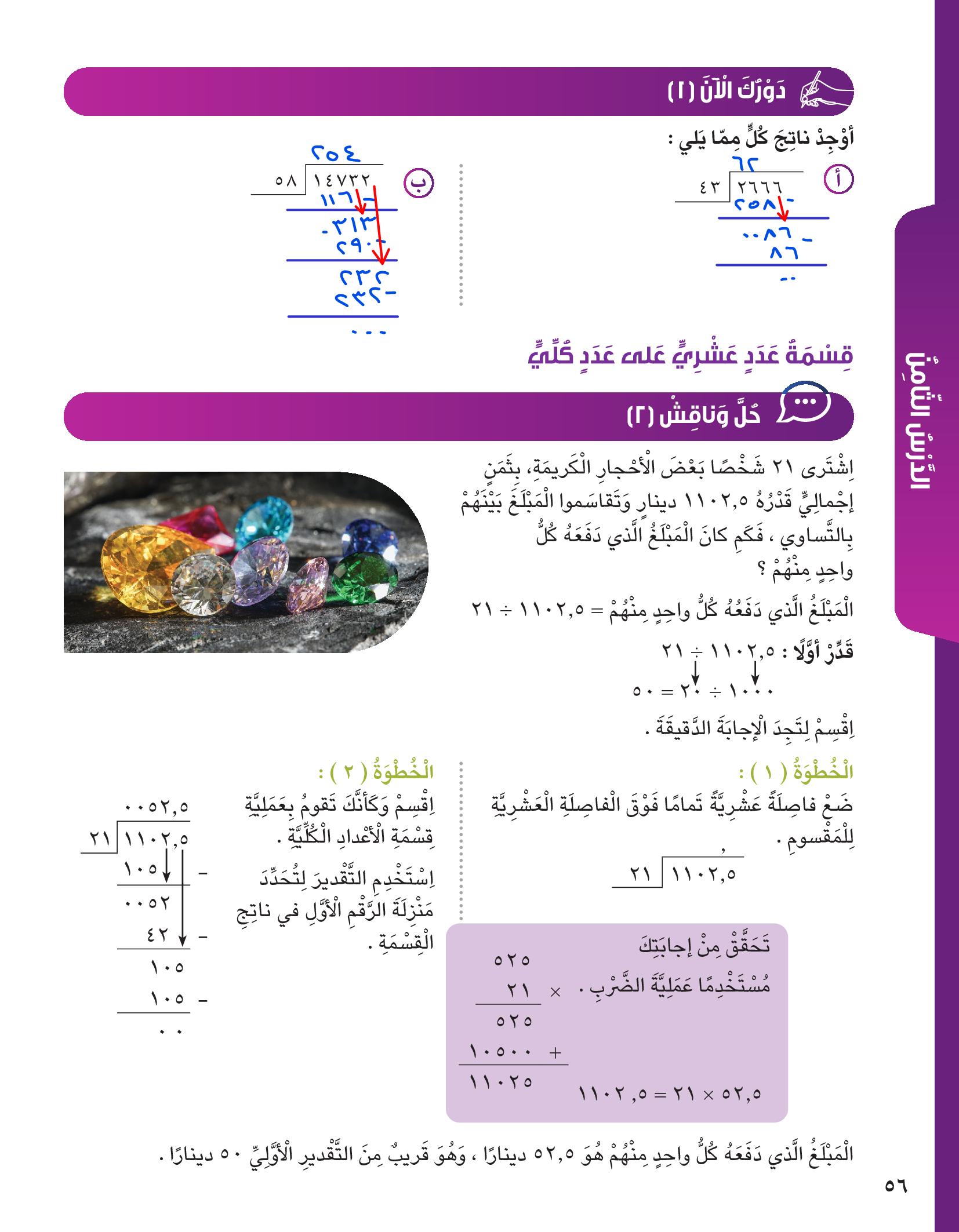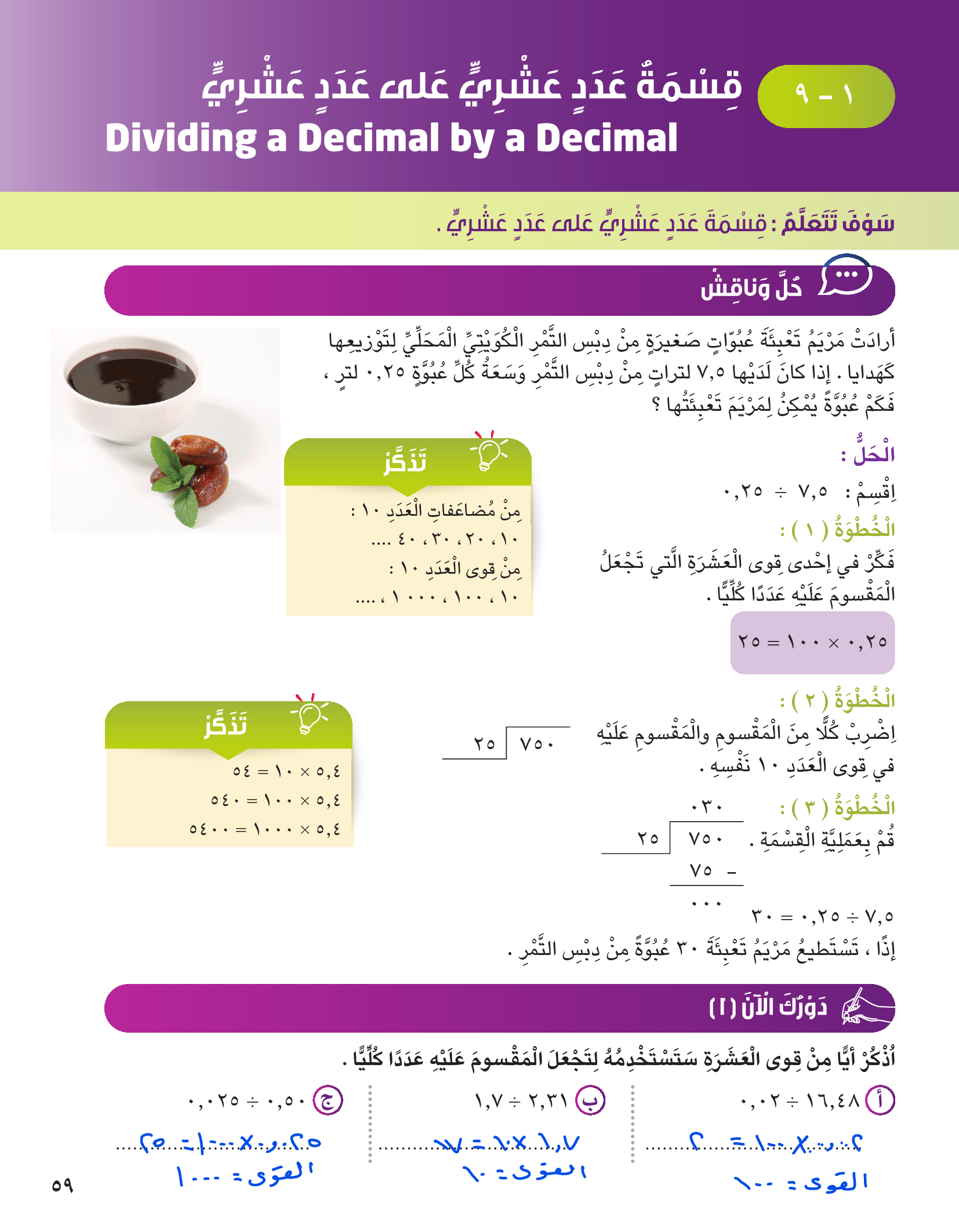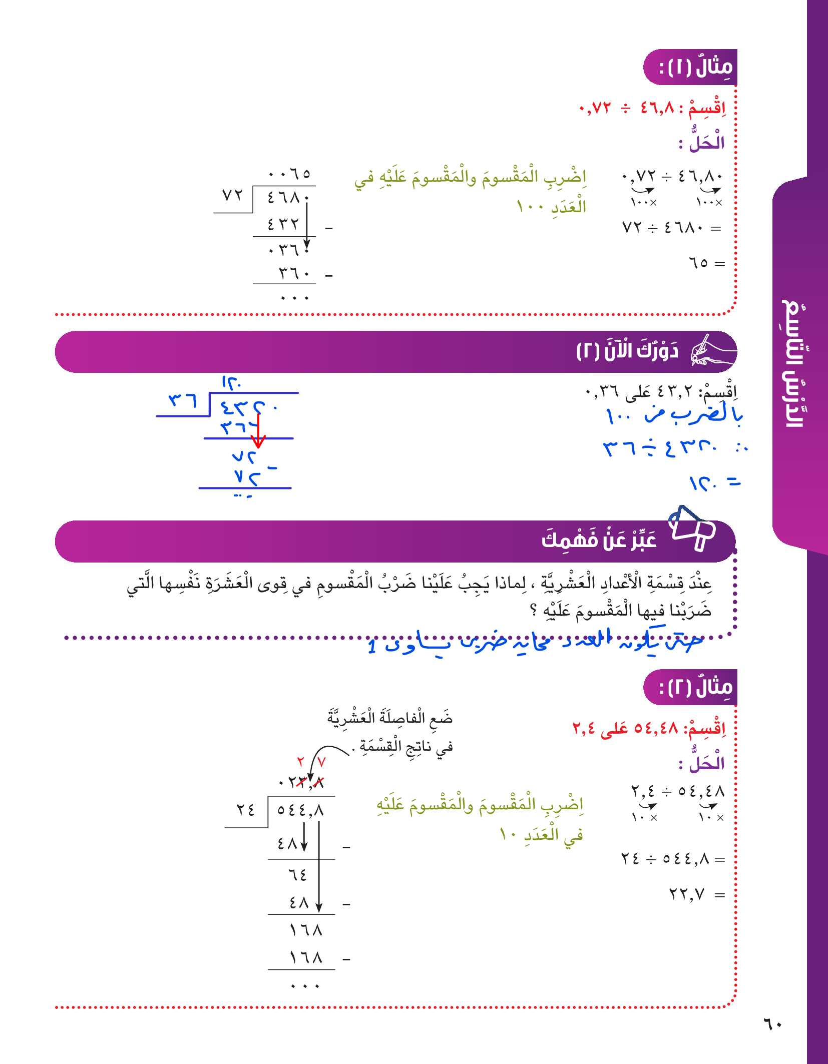 قسمة الأعداد الكلية والأعداد العشرية على عدد مكون رمزه من رقمين