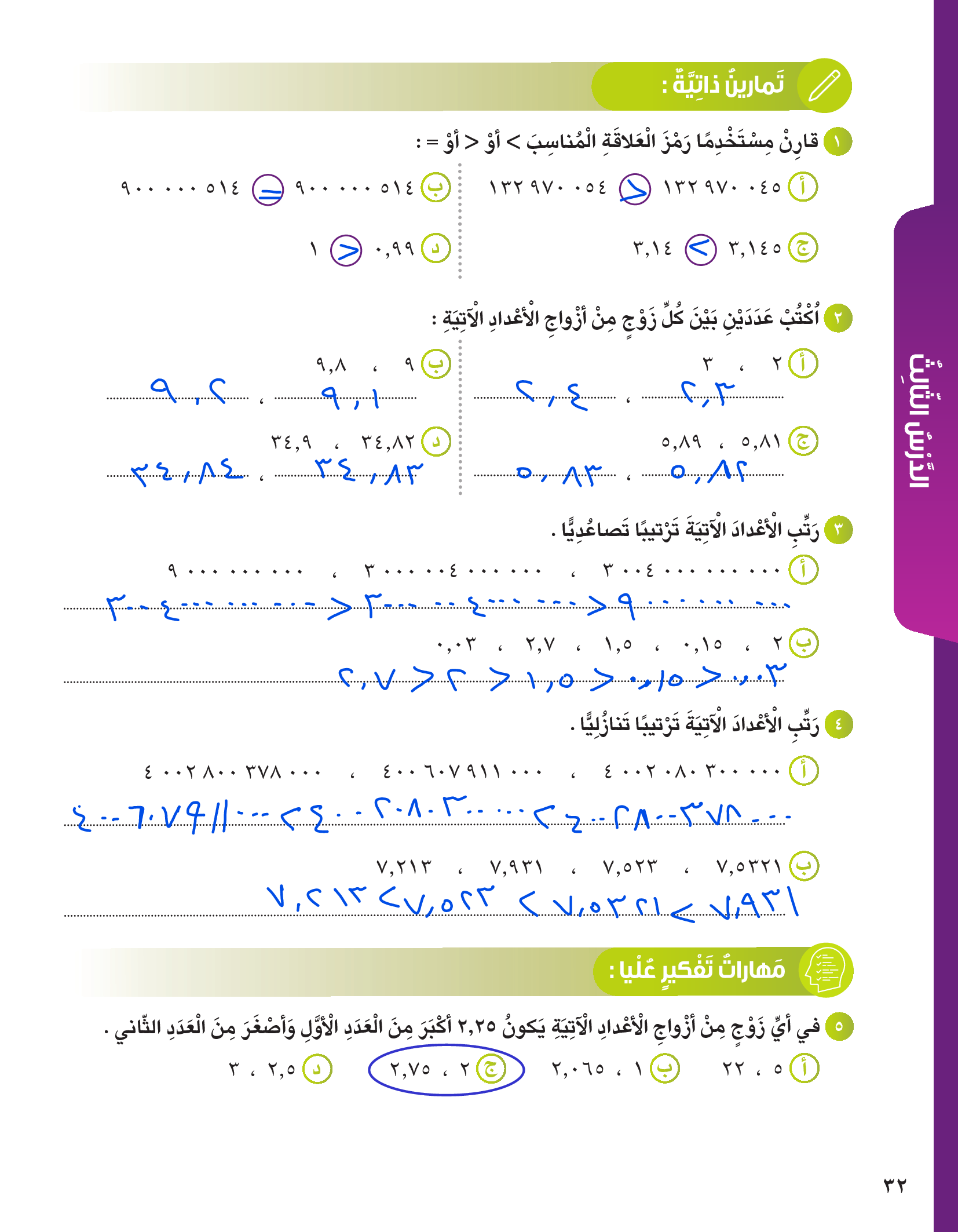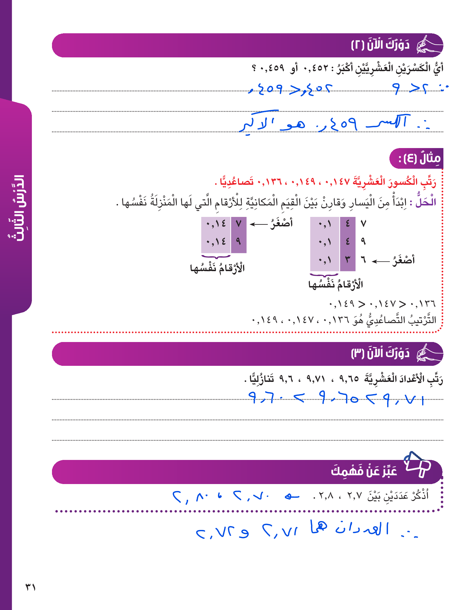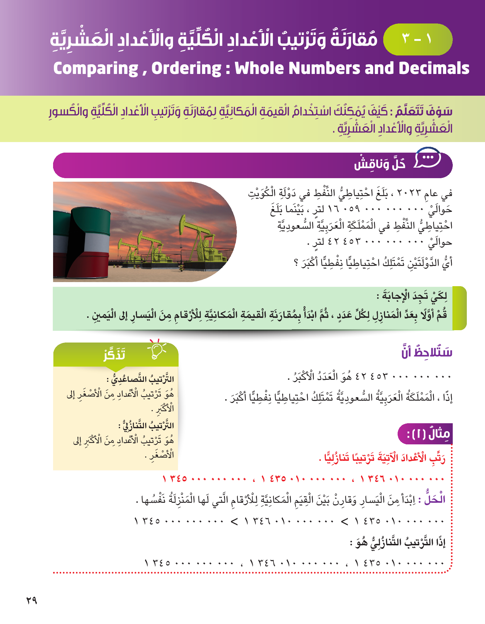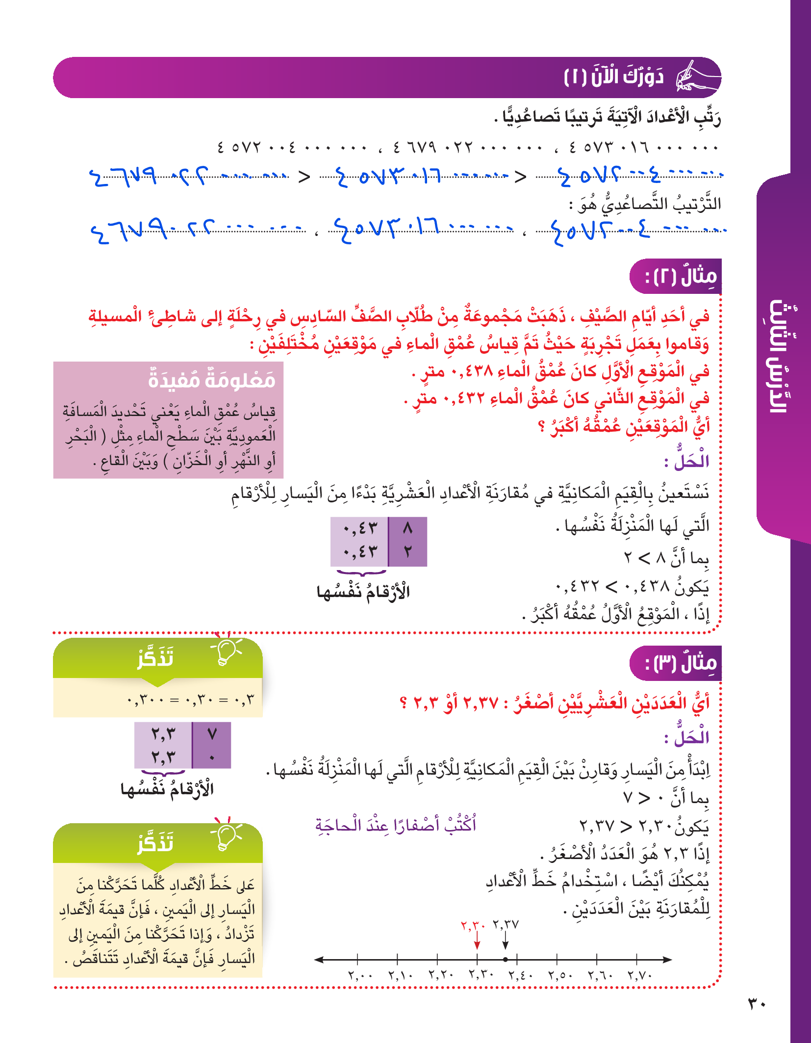 مقارنة وترتيب الأعداد الكلية والأعداد العشرية