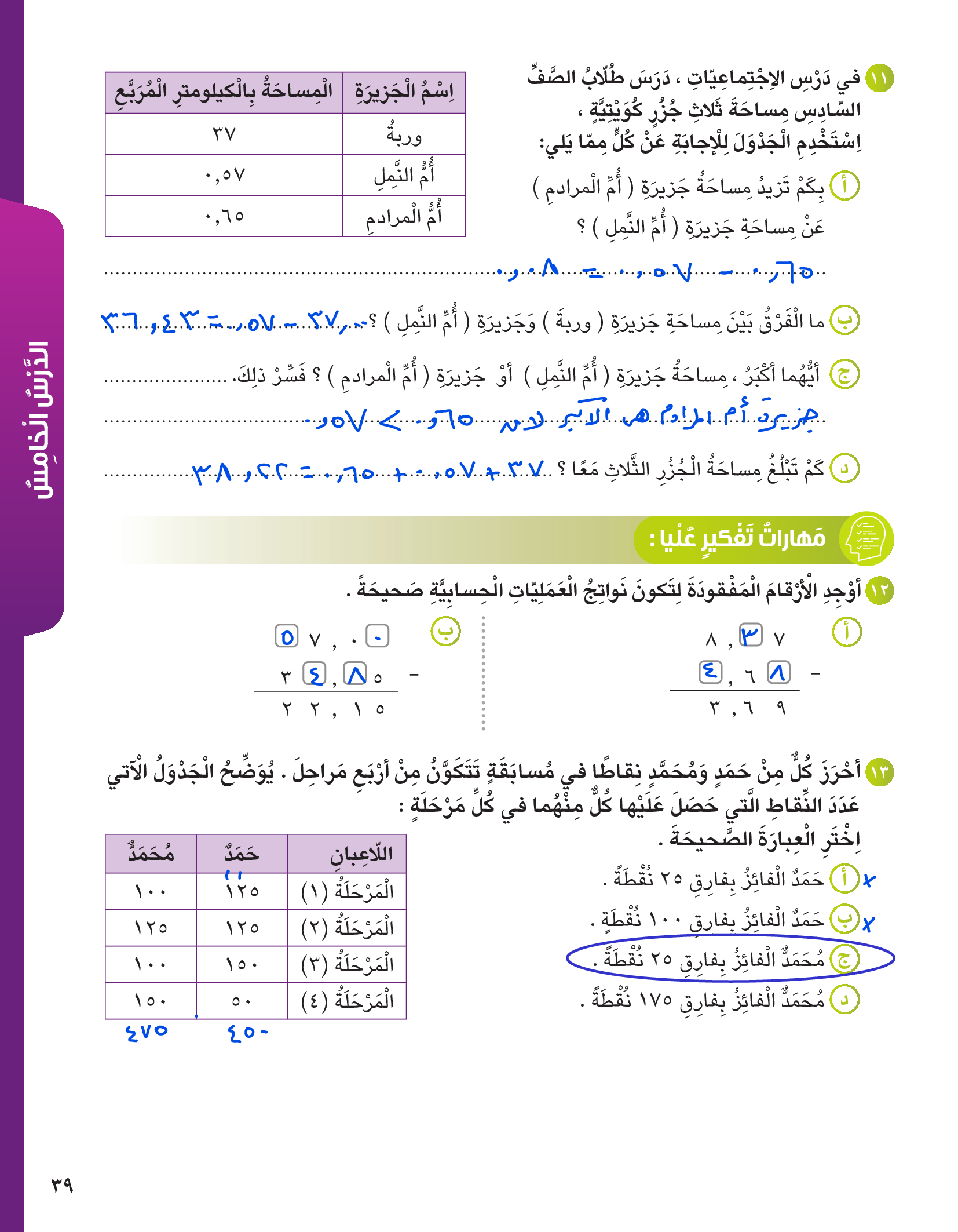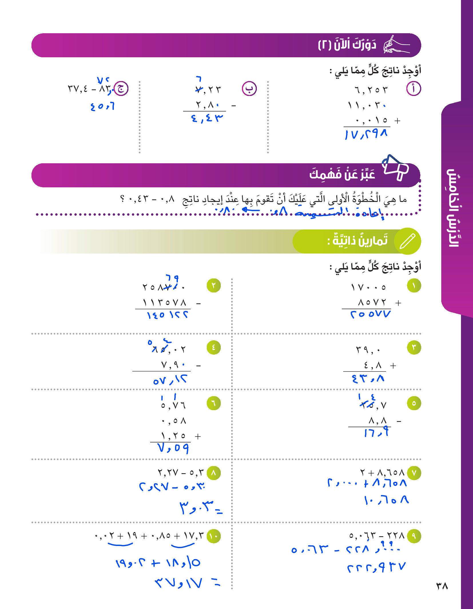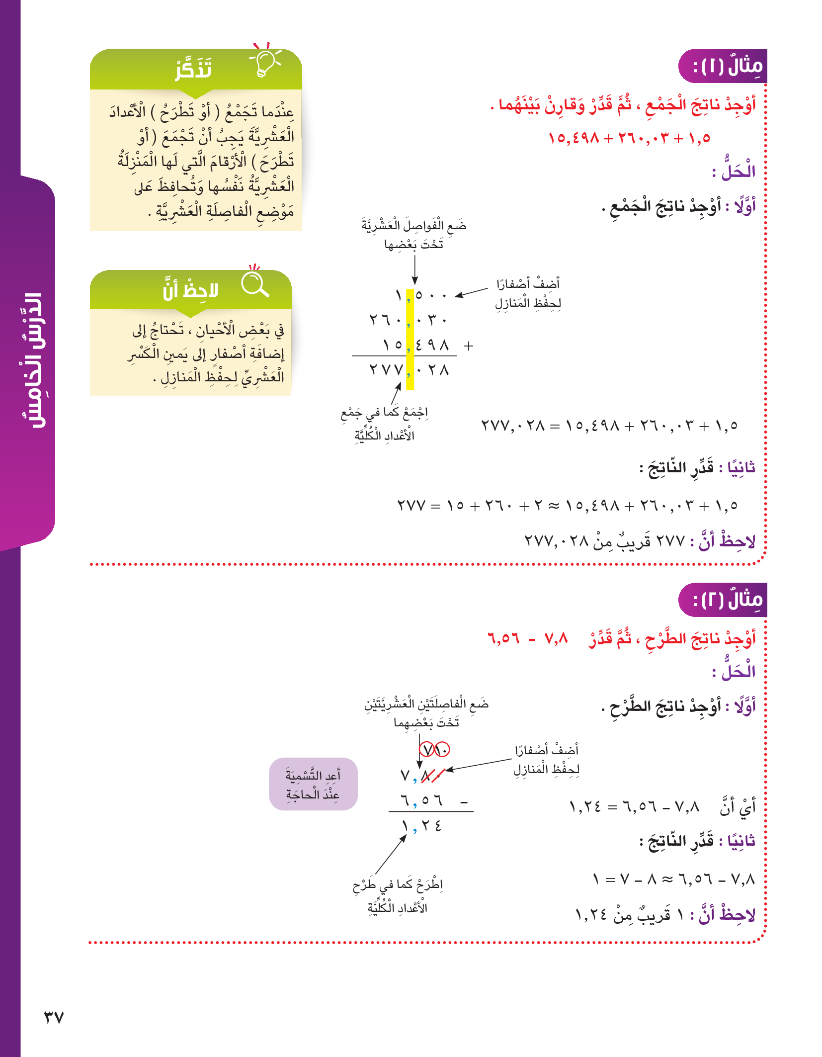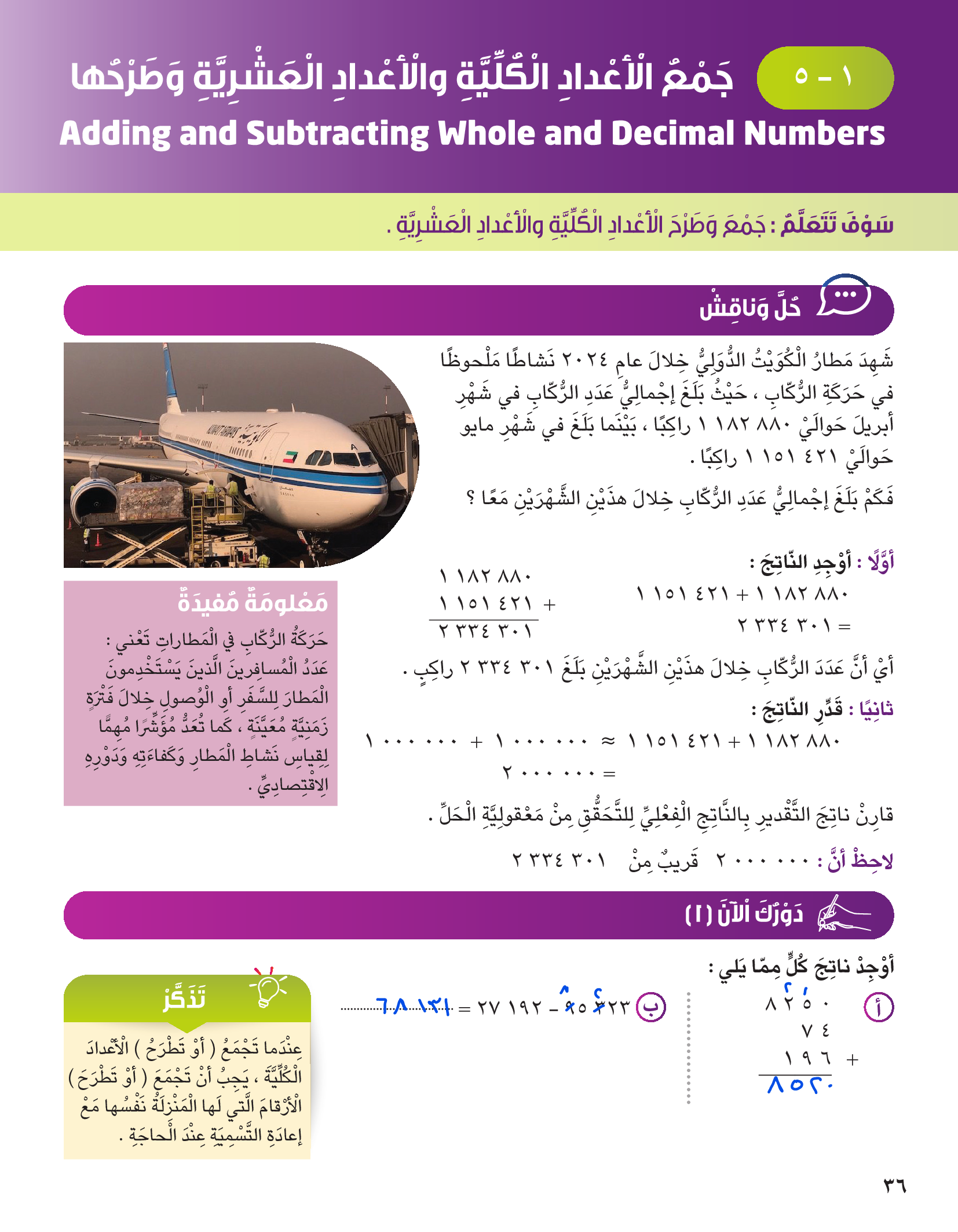 جمع الأعداد الكلية والأعداد العشرية وطرحها