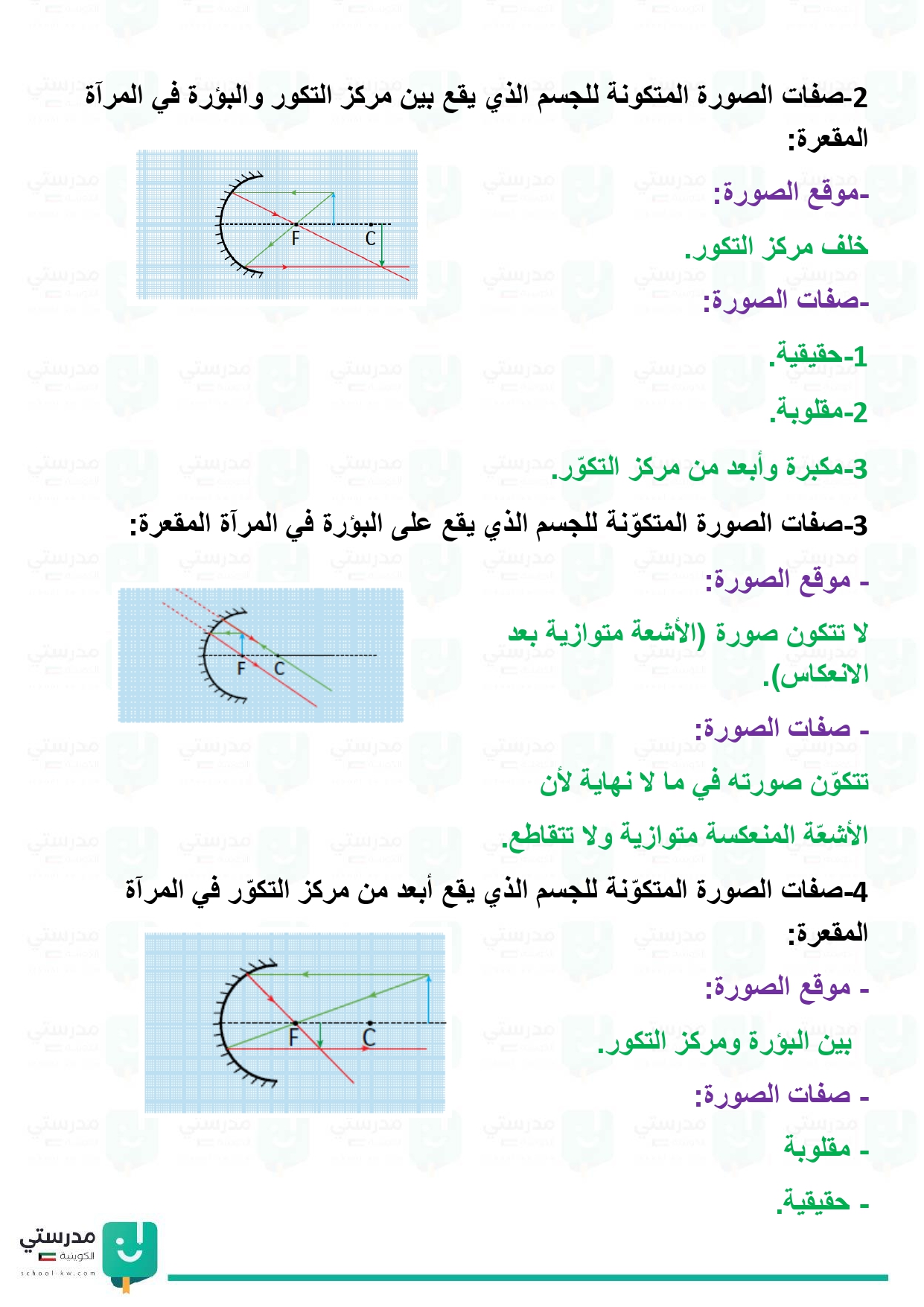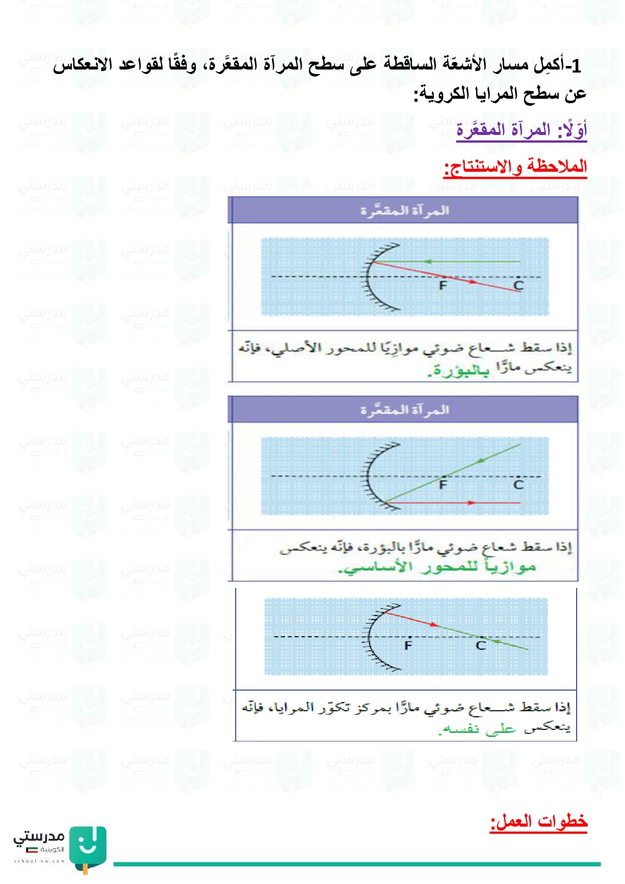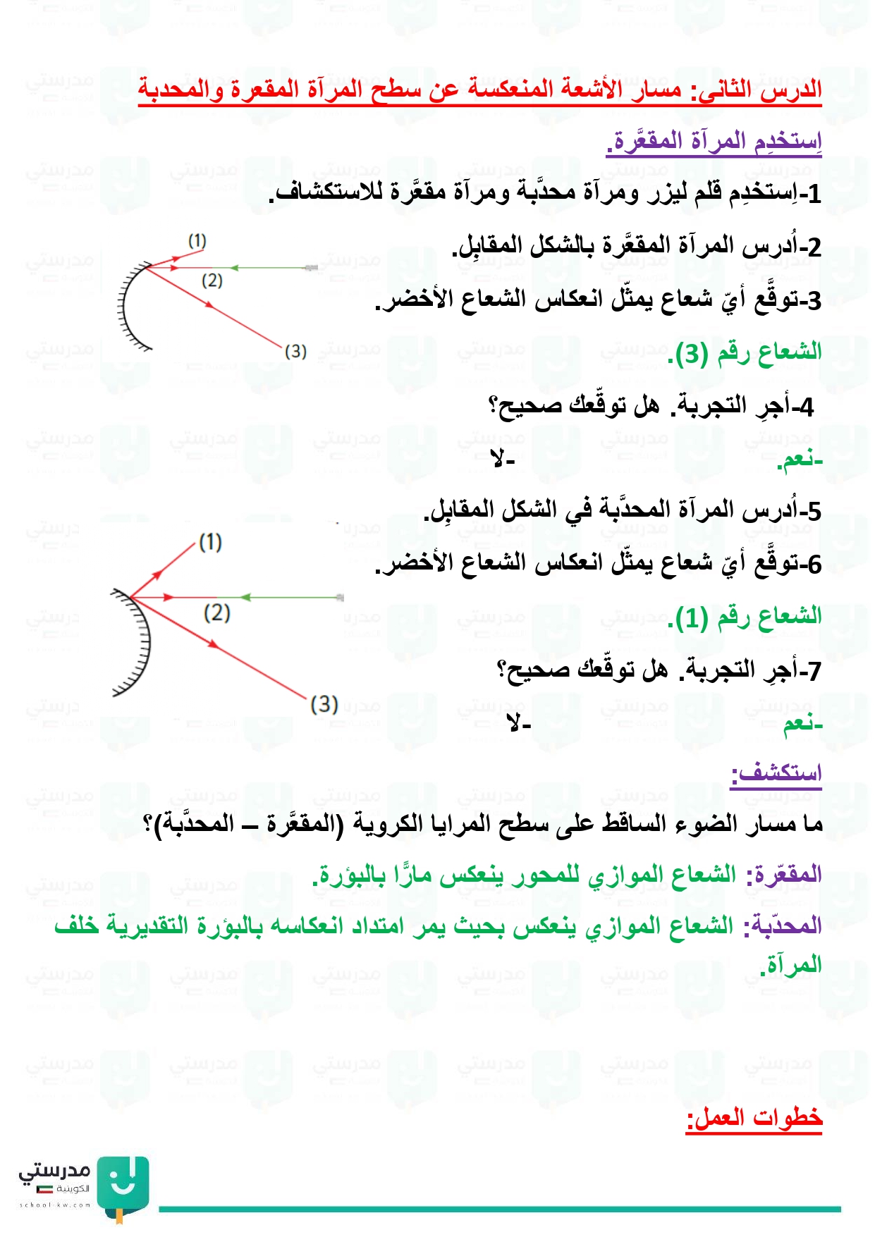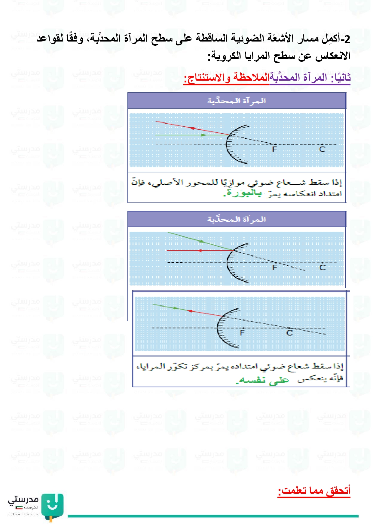 مسار الأشعة المنعكسة عن سطح المرآة المقعرة والمحدبة