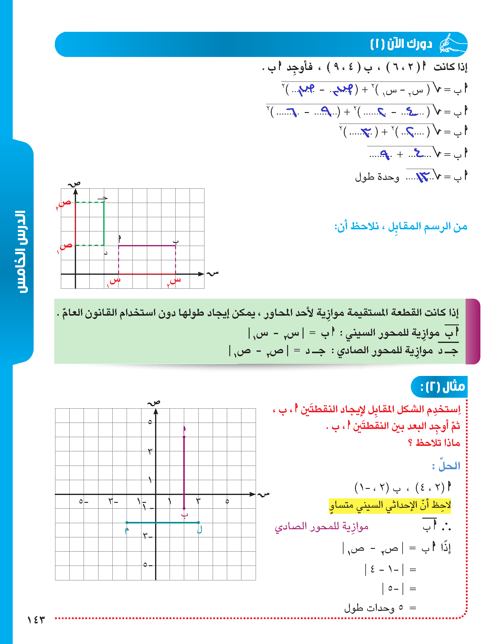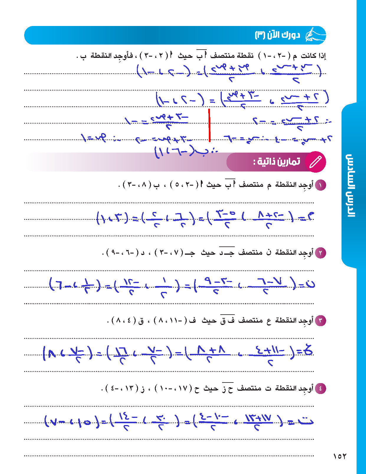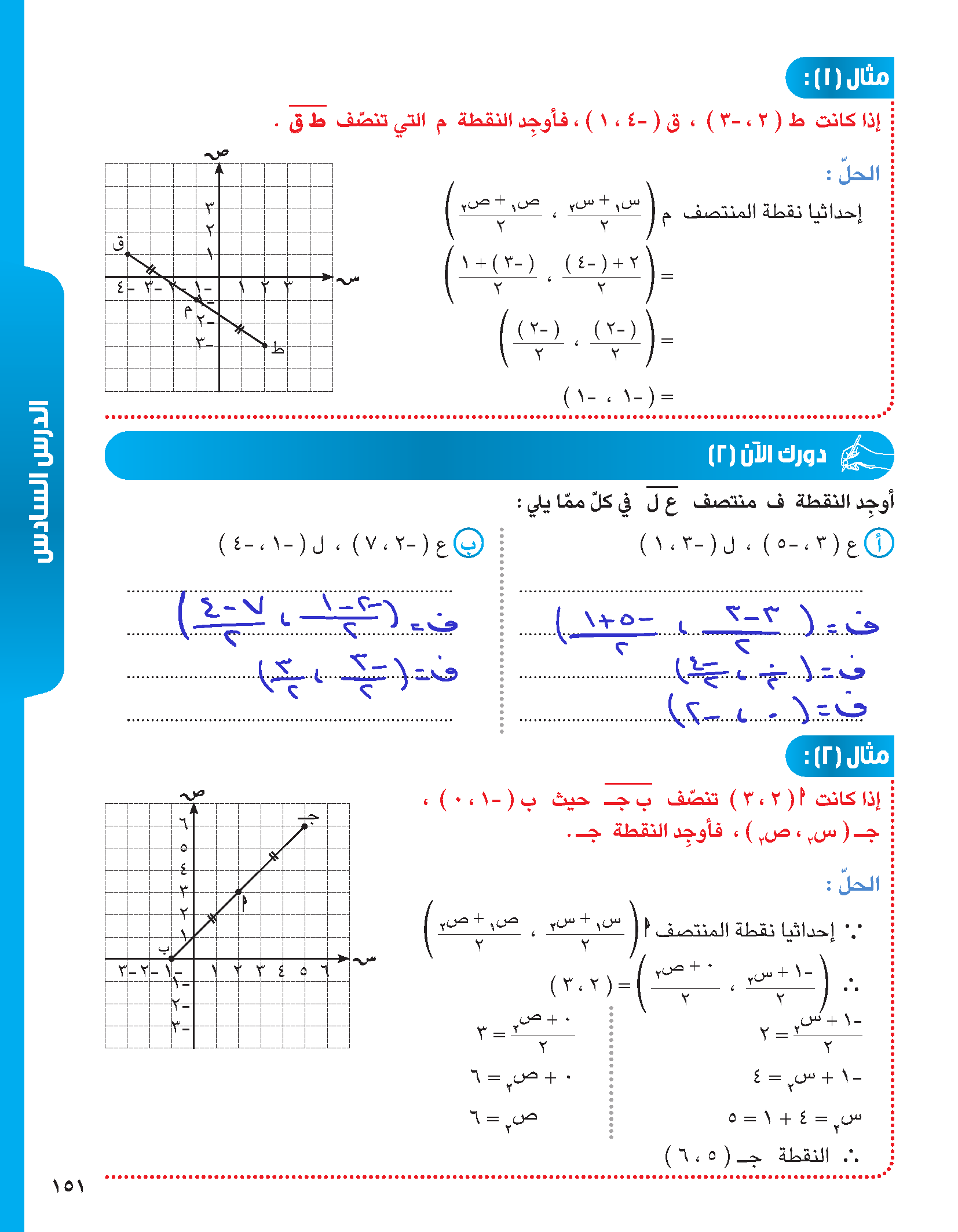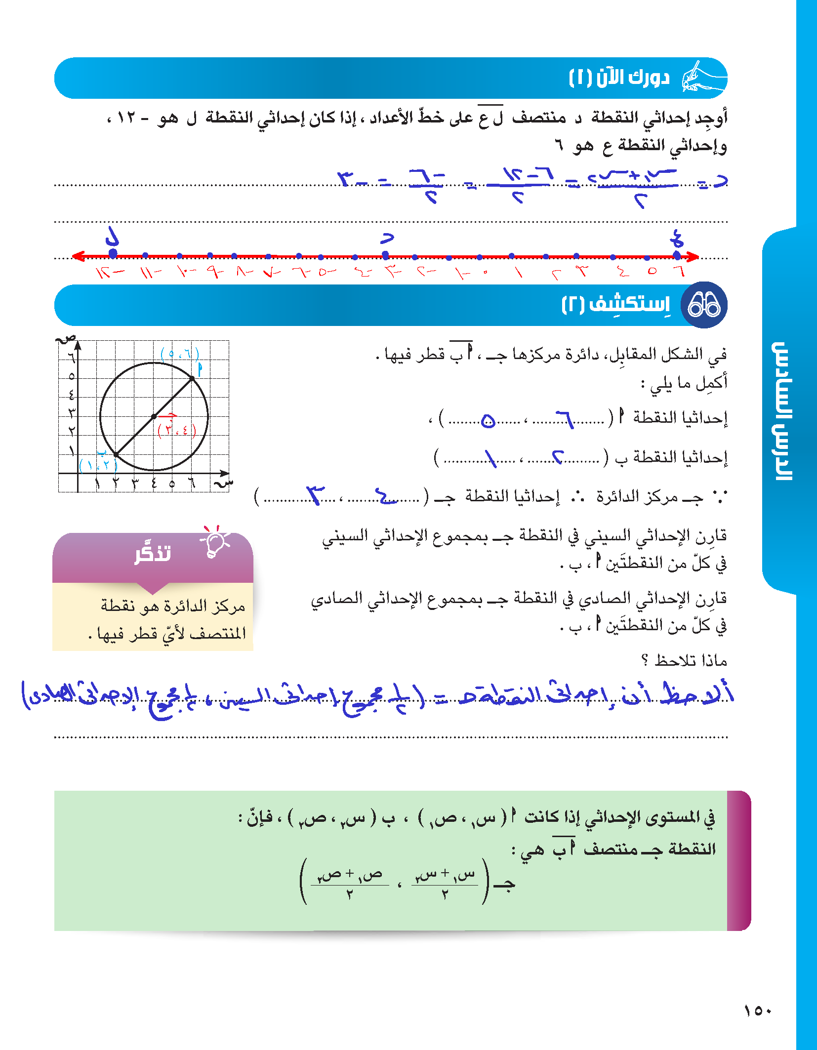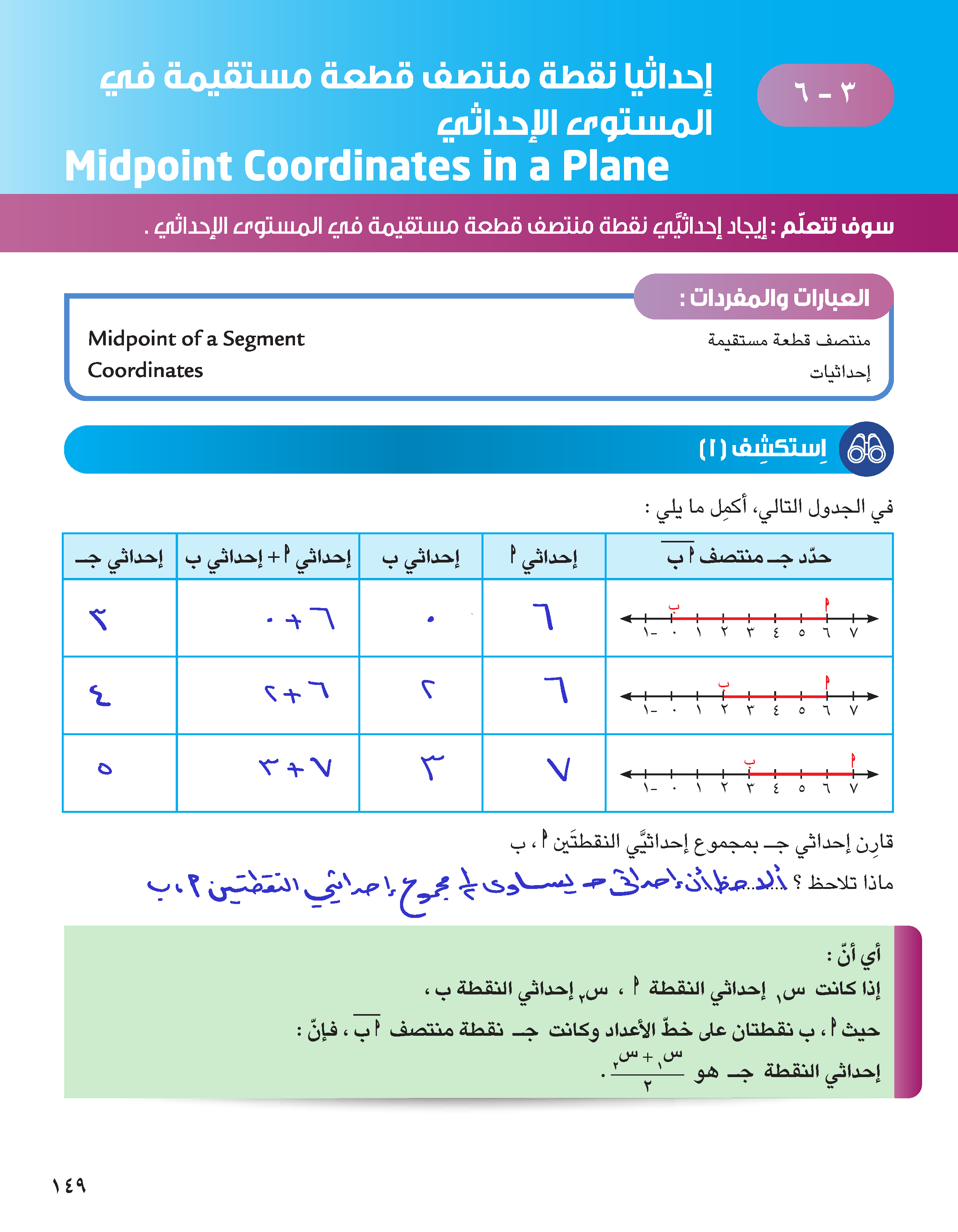 احداثيا نقطة منتصف قطعة مستقيمة في المستوى الاحداثي