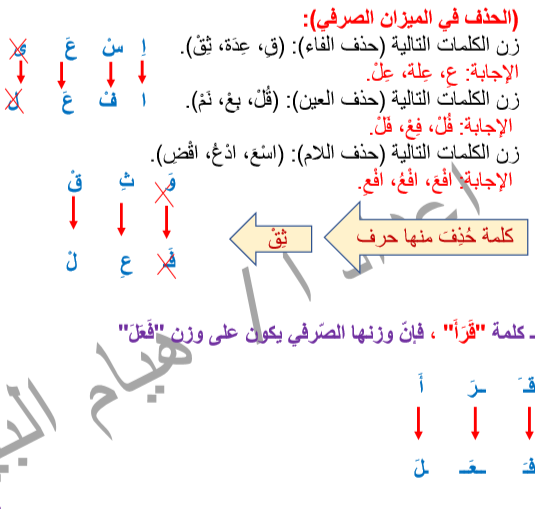 - إذا حُذف من الكلمة حرف أو أكثر ، نحذف ما يقابله في الميزان