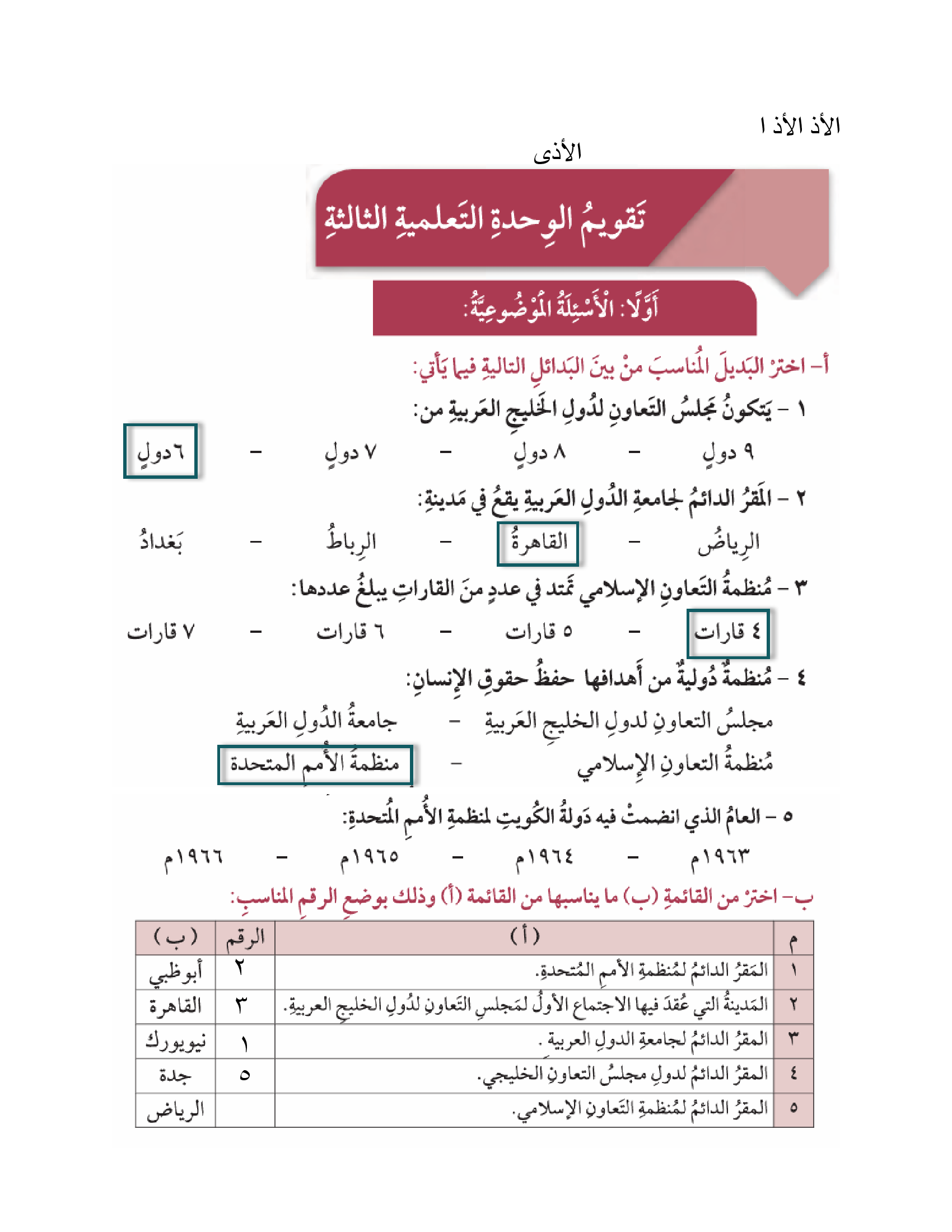 تقويم الوحدة الثالثة