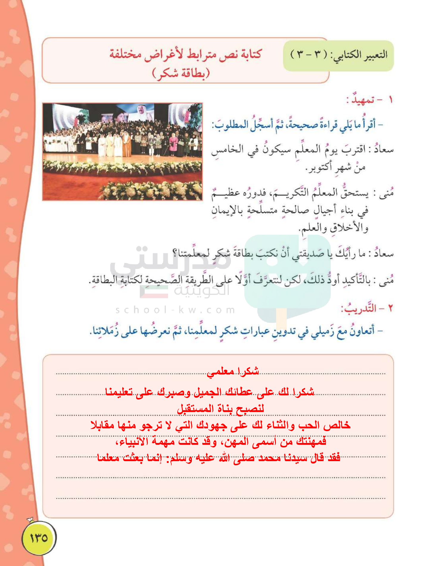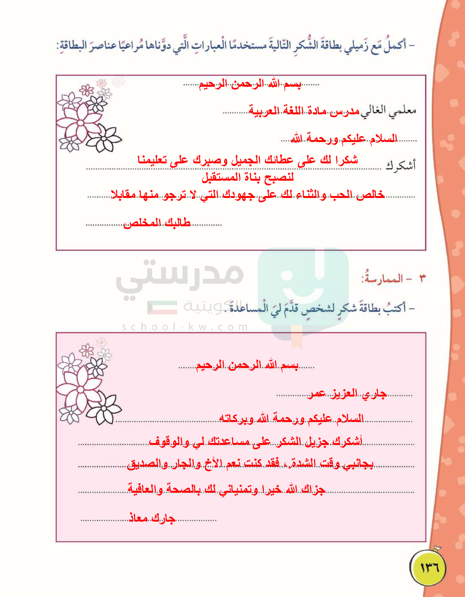كتابة نص مترابط لأغراض مختلفة (بطاقة شكر)