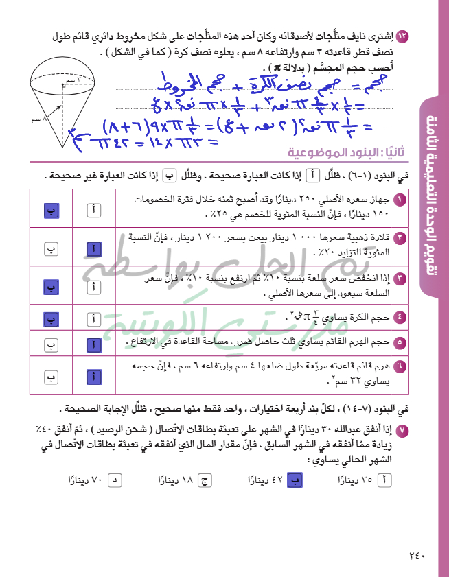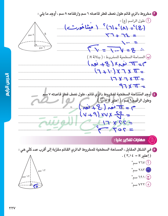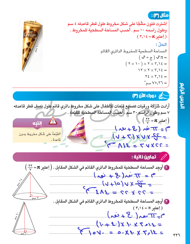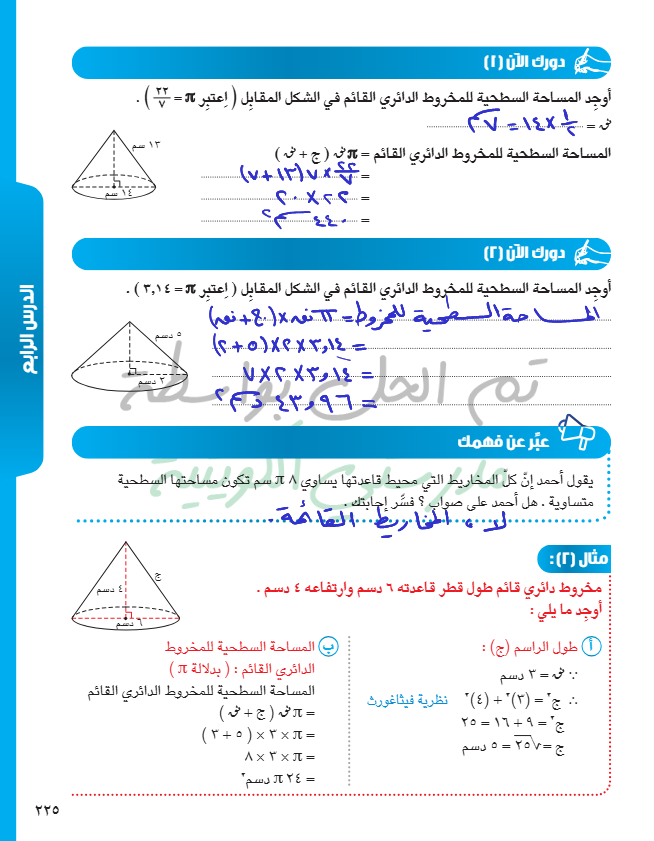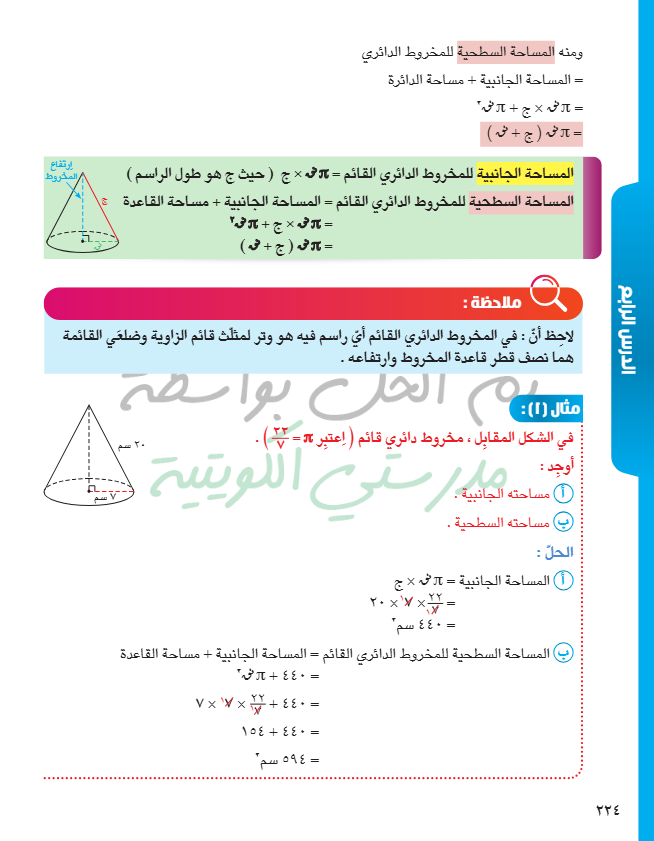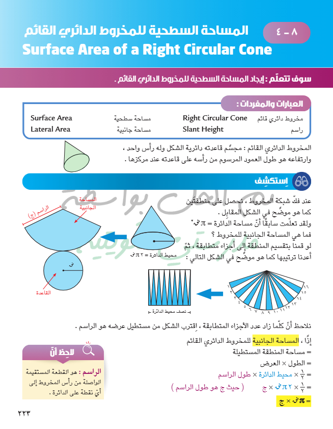 المساحة السطحية للمخروط الدائري القائم