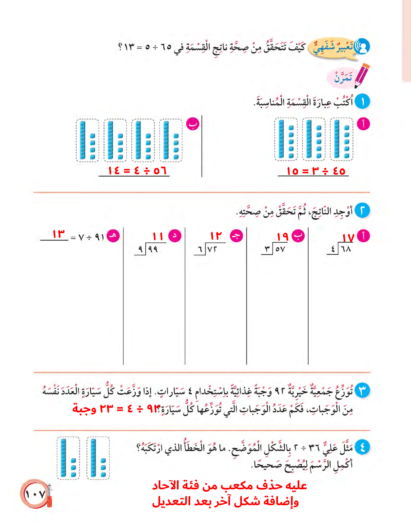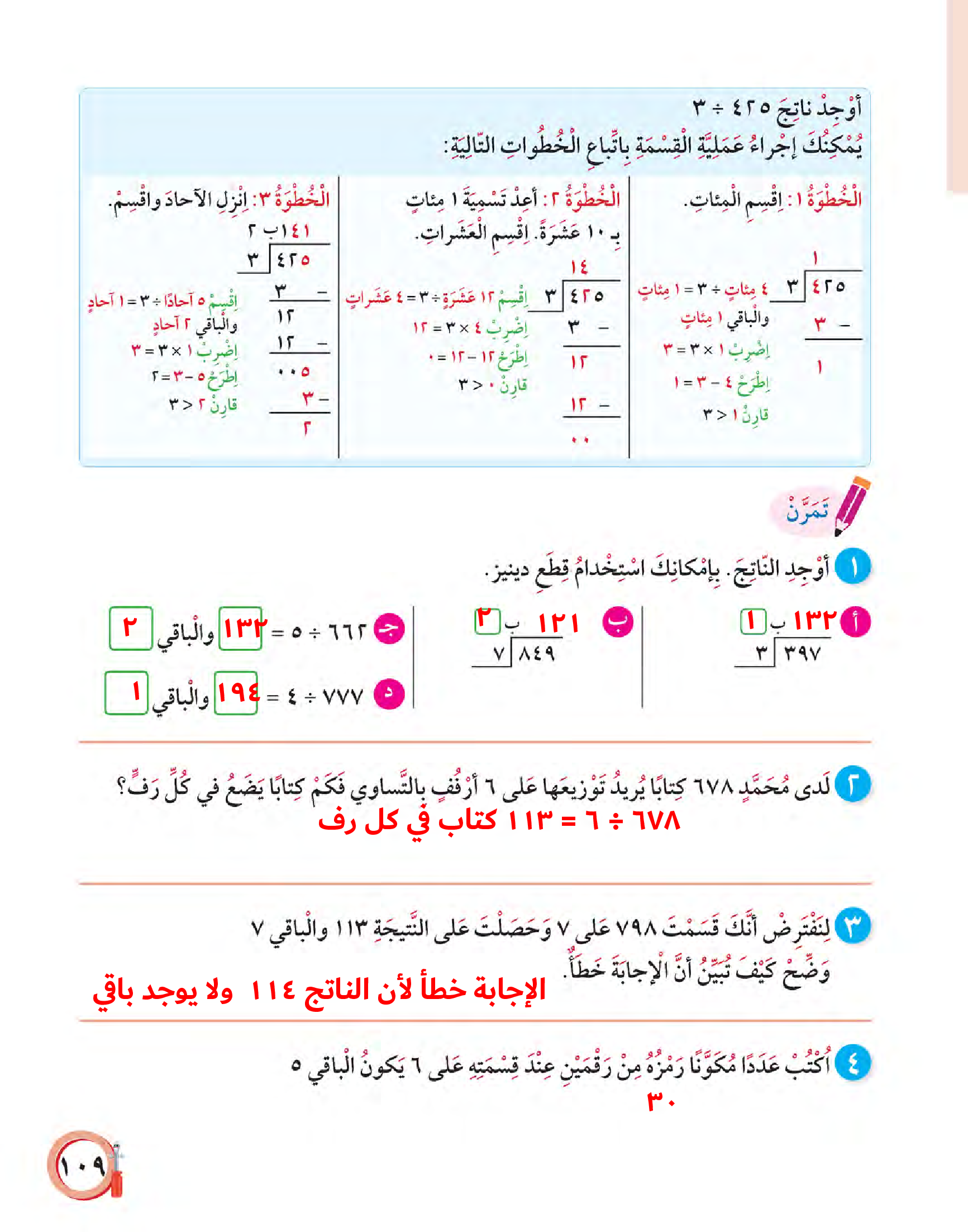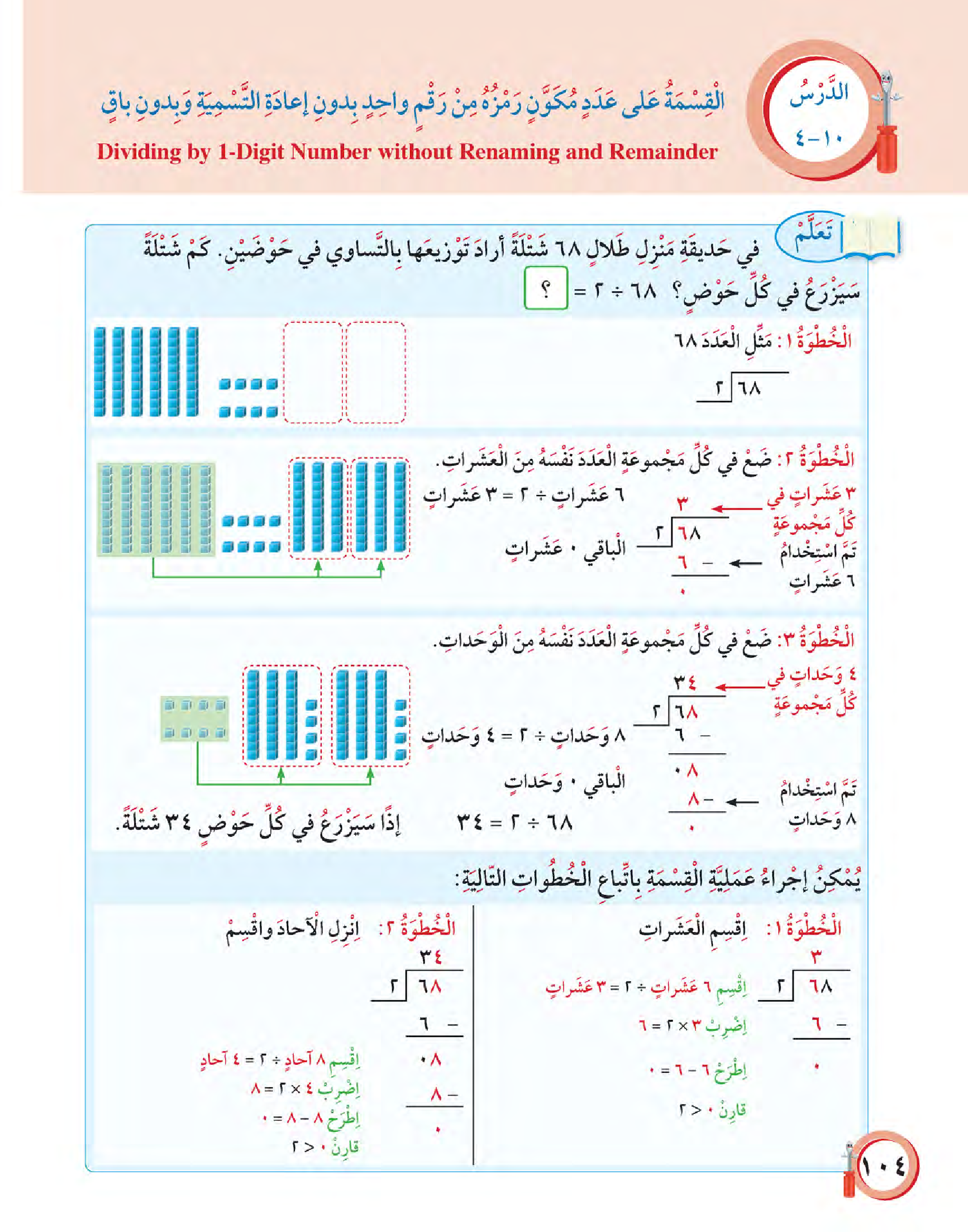 القسمة على عدد مكون رمزه من رقم واحد بدون اعادة التسمية وبدون باق