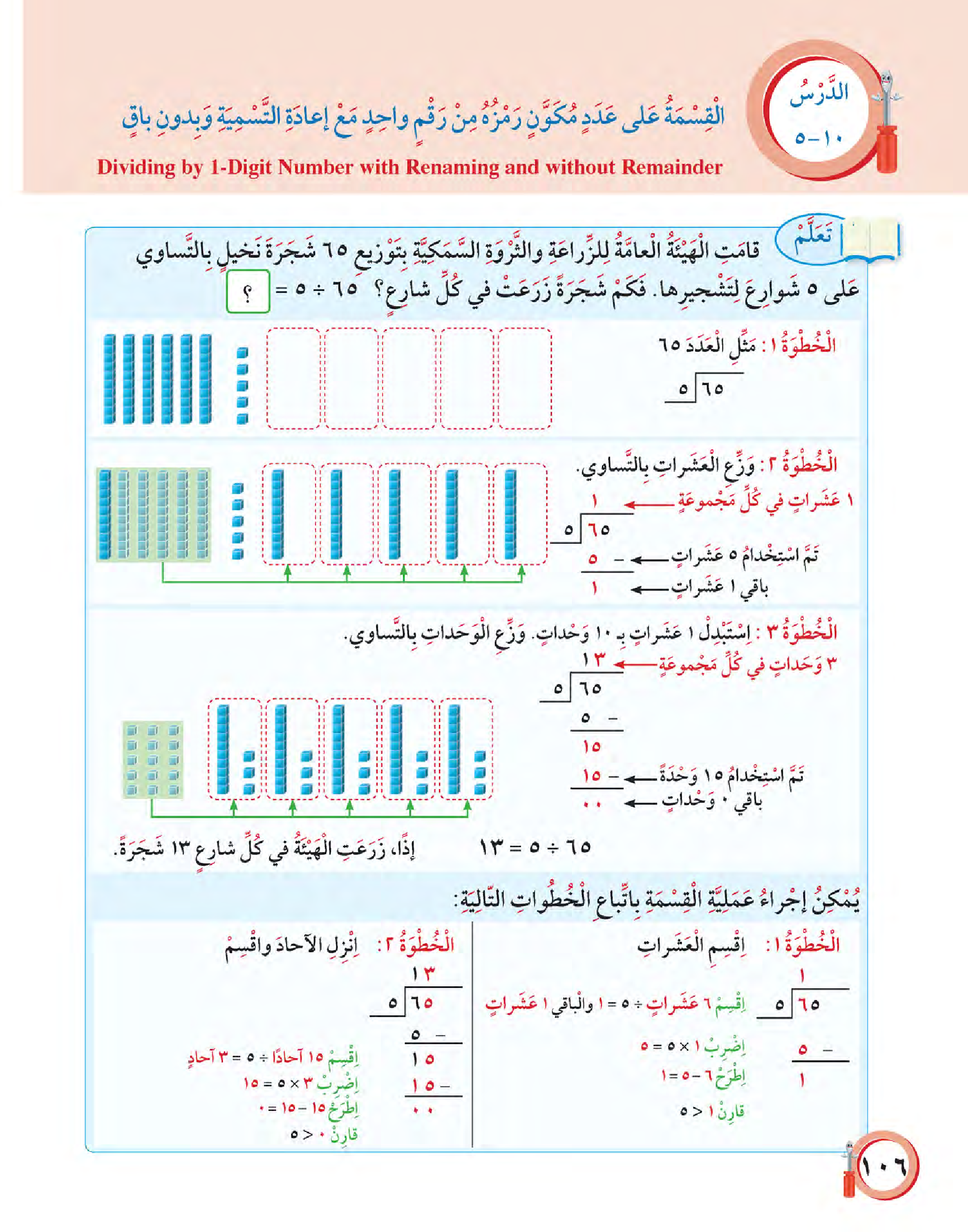 القسمة على عدد مكون رمزه من رقم واحد مع اعادة التسمية وبدون باق