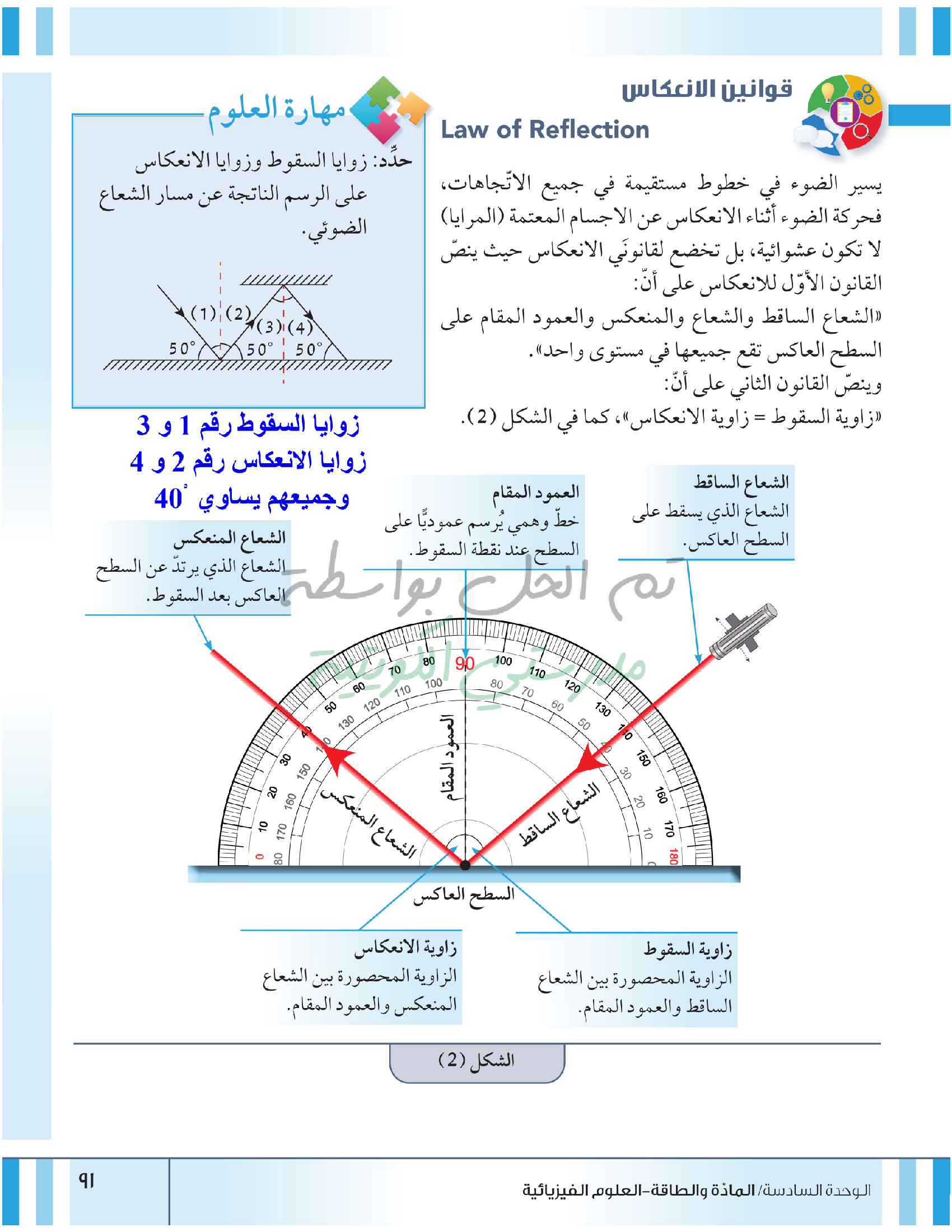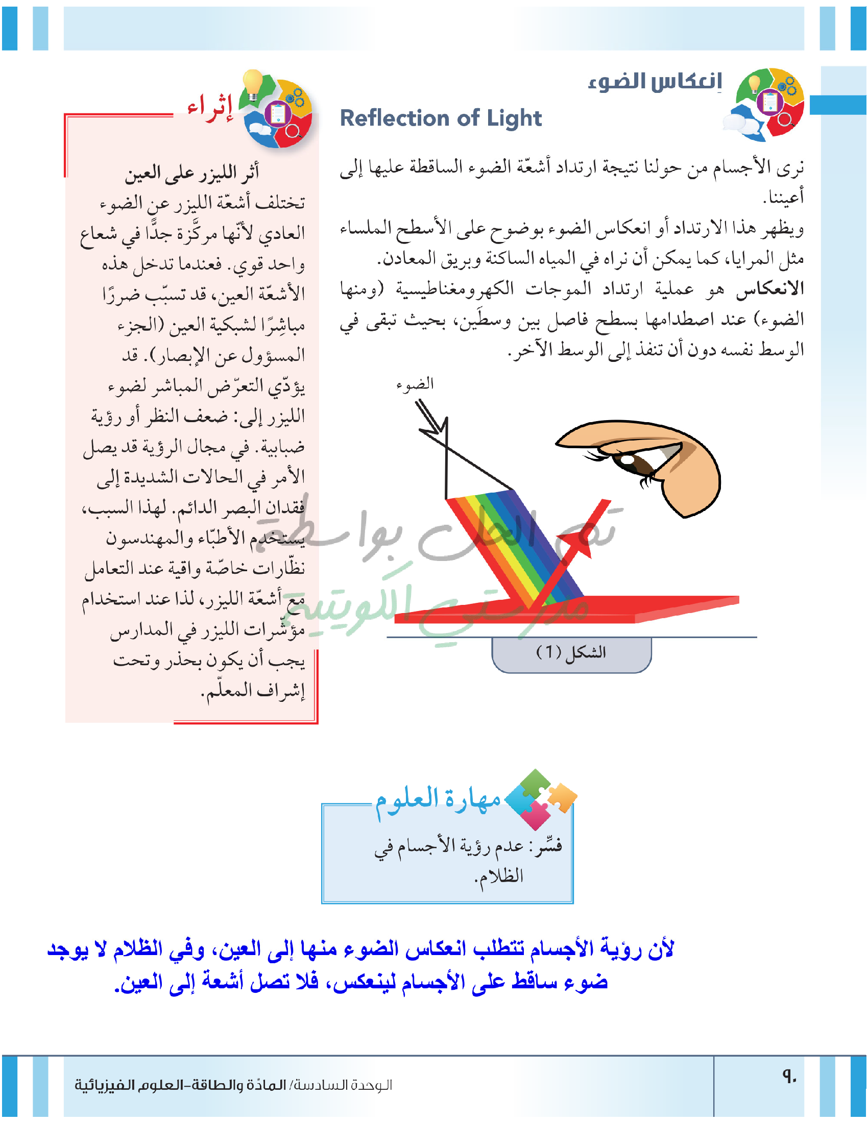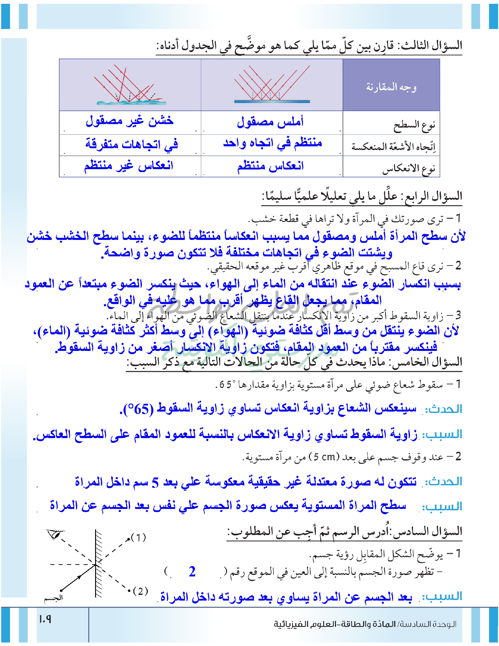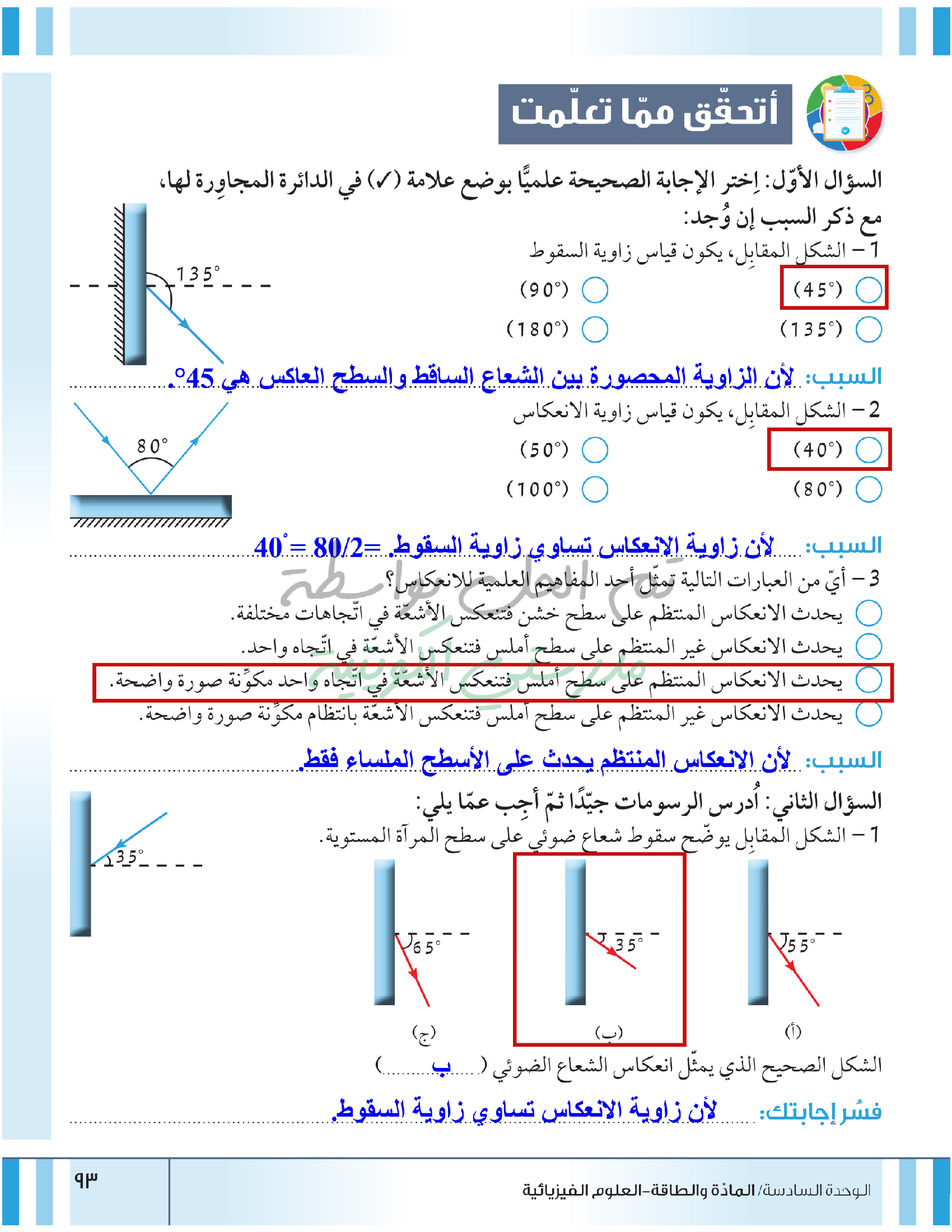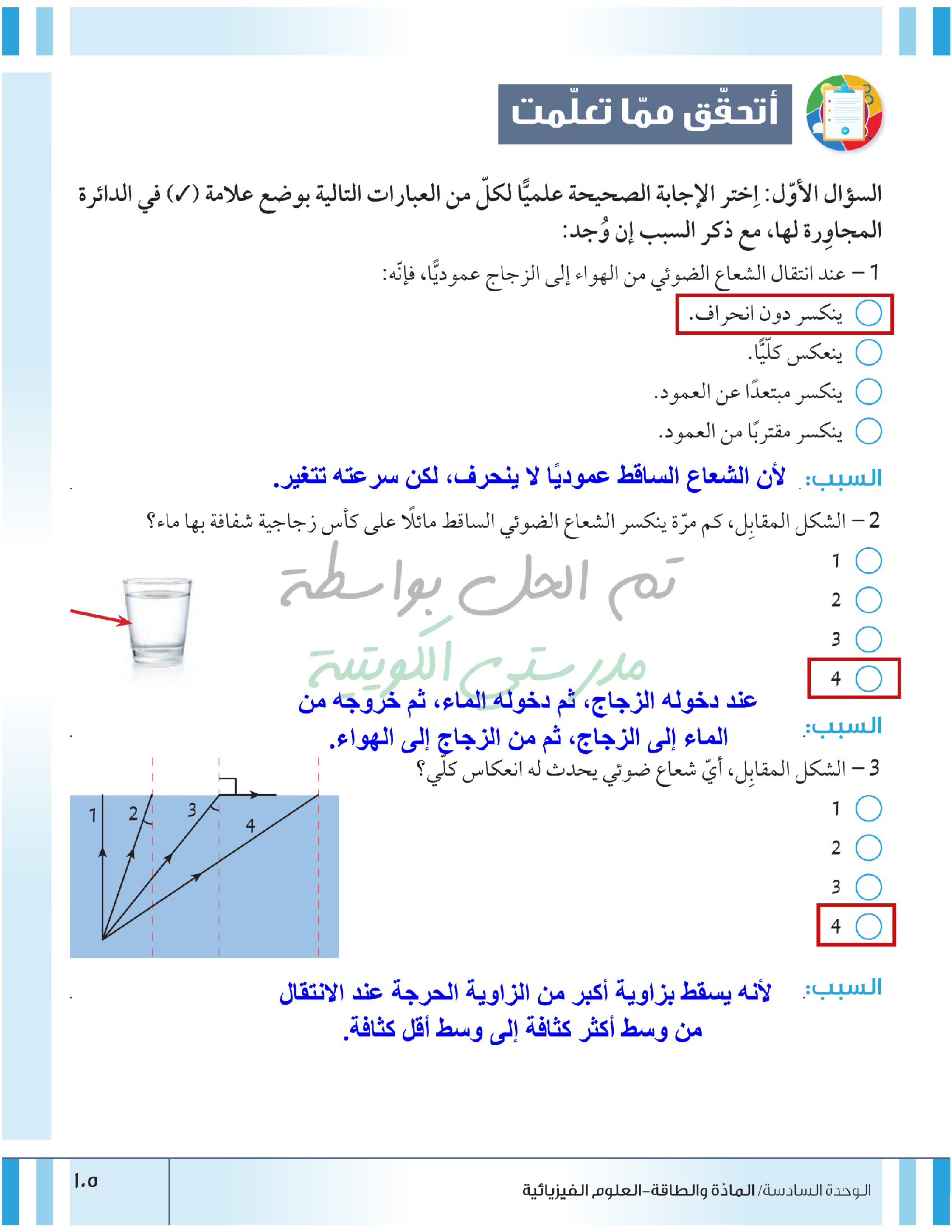 تقييم نهاية فصل انعكاس وانكسار الضوء