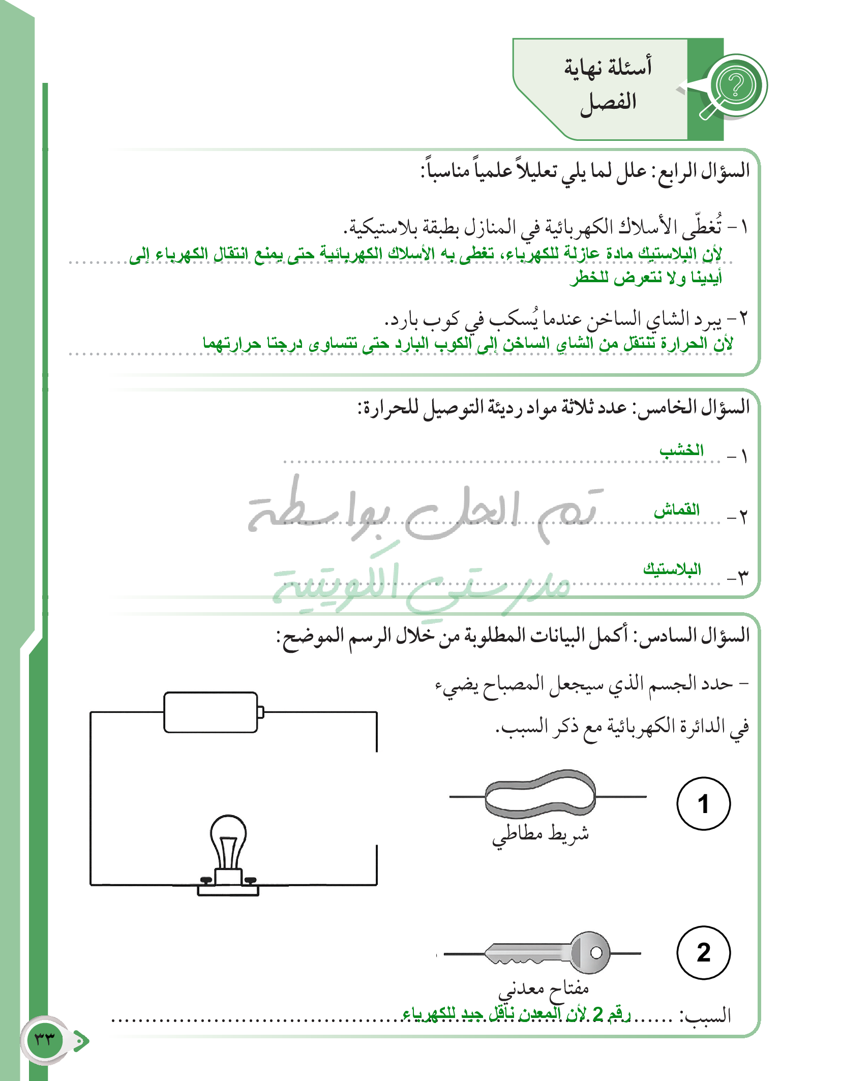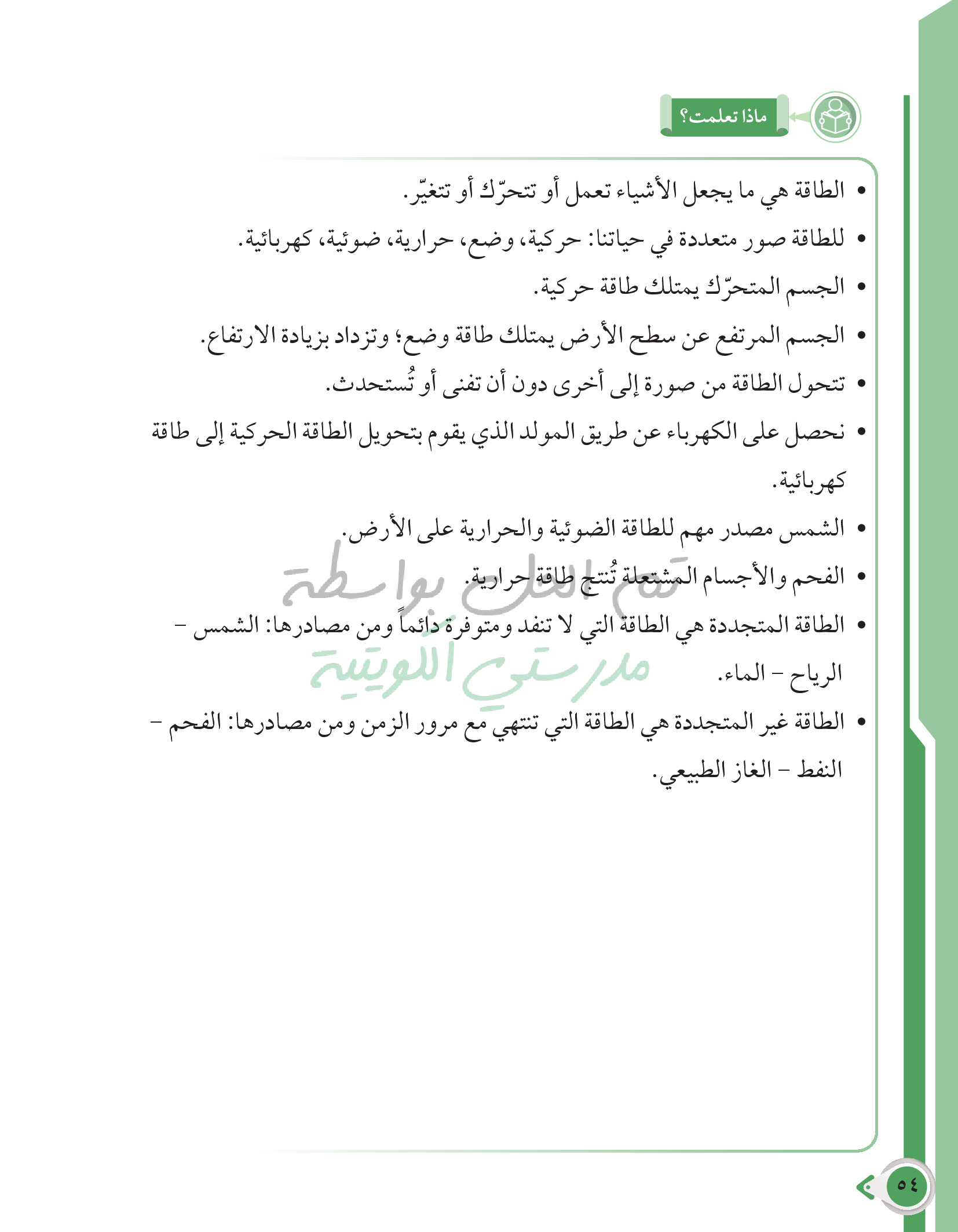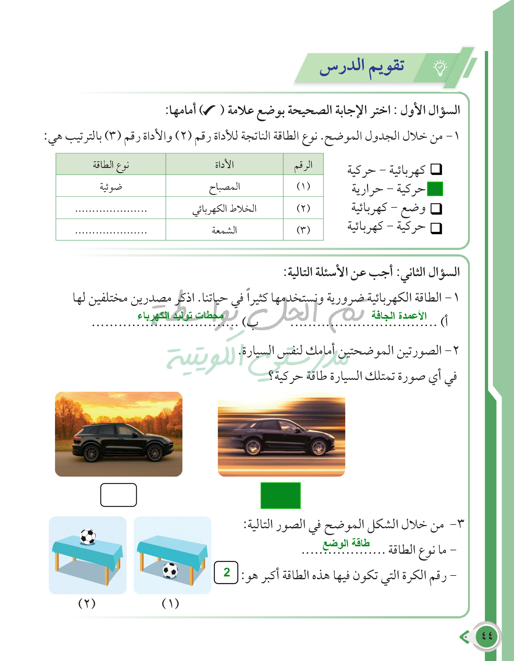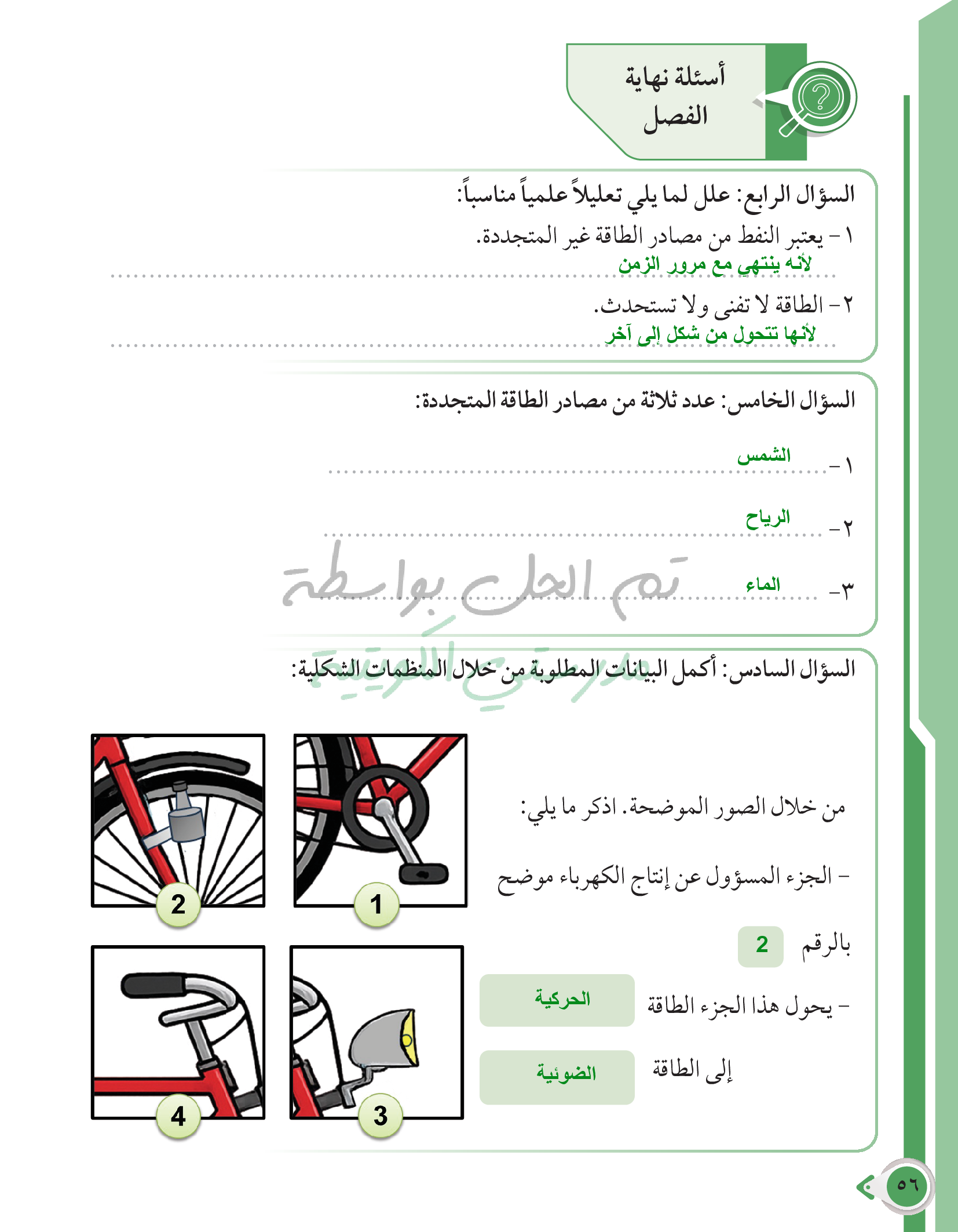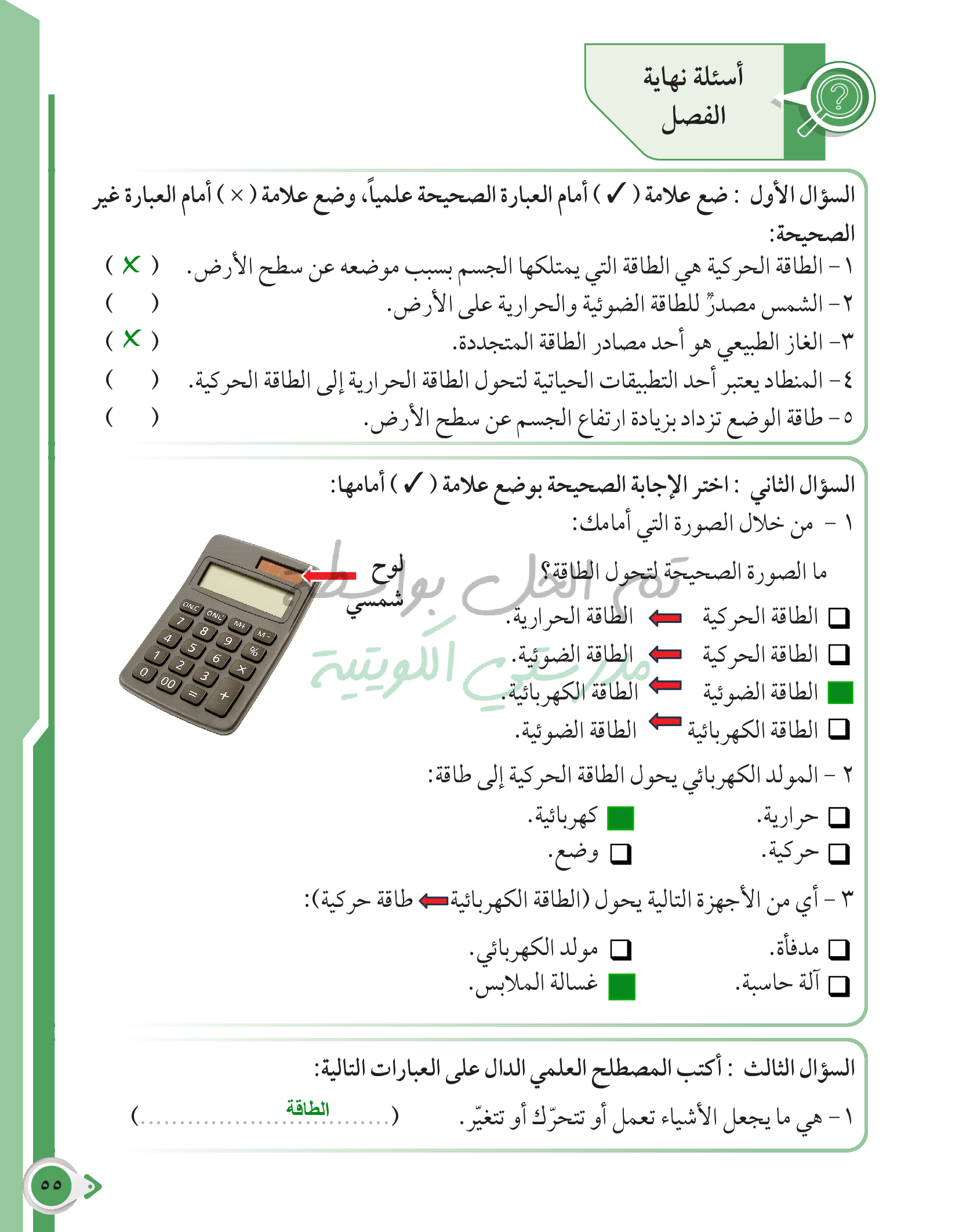 أسئلة نهاية فصل الطاقة وتحولاتها