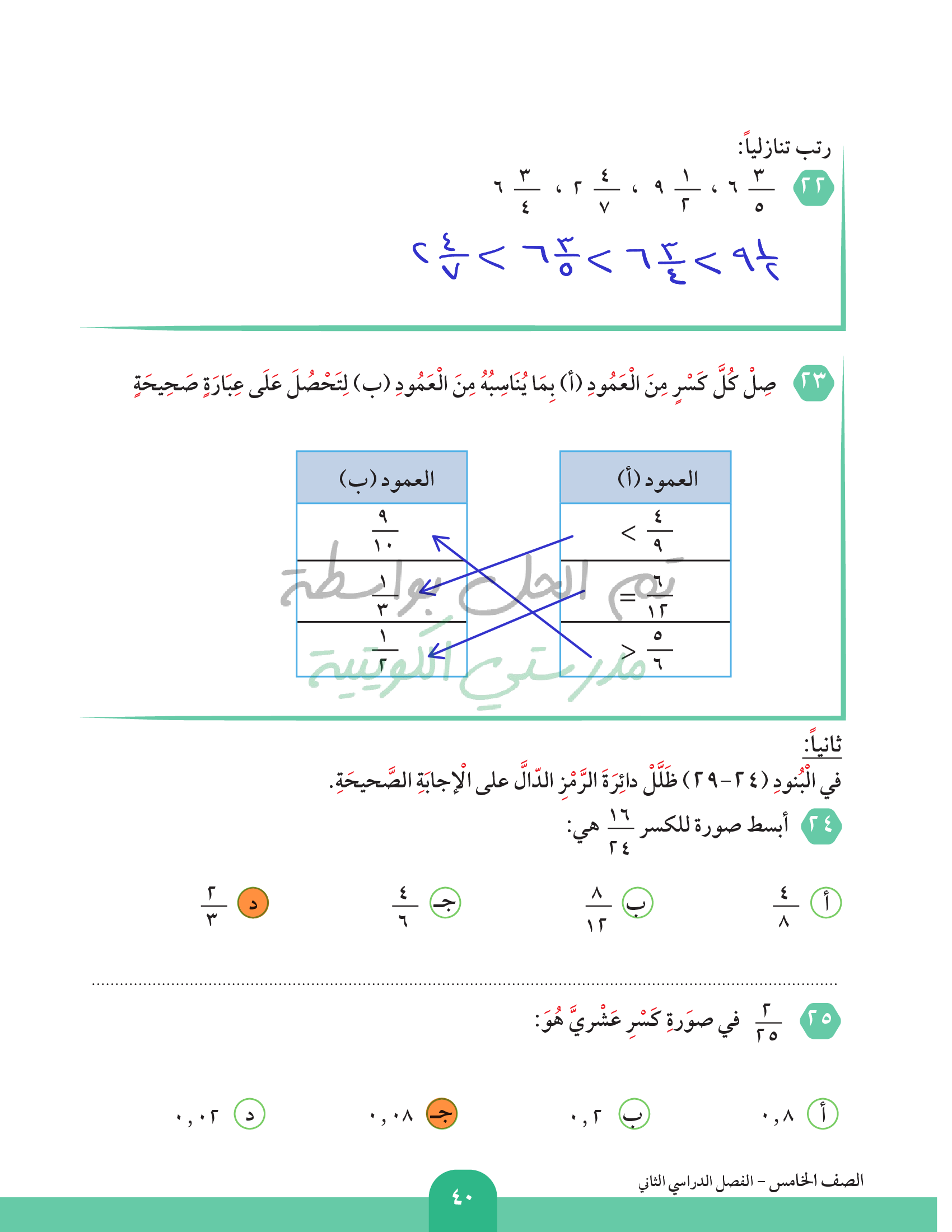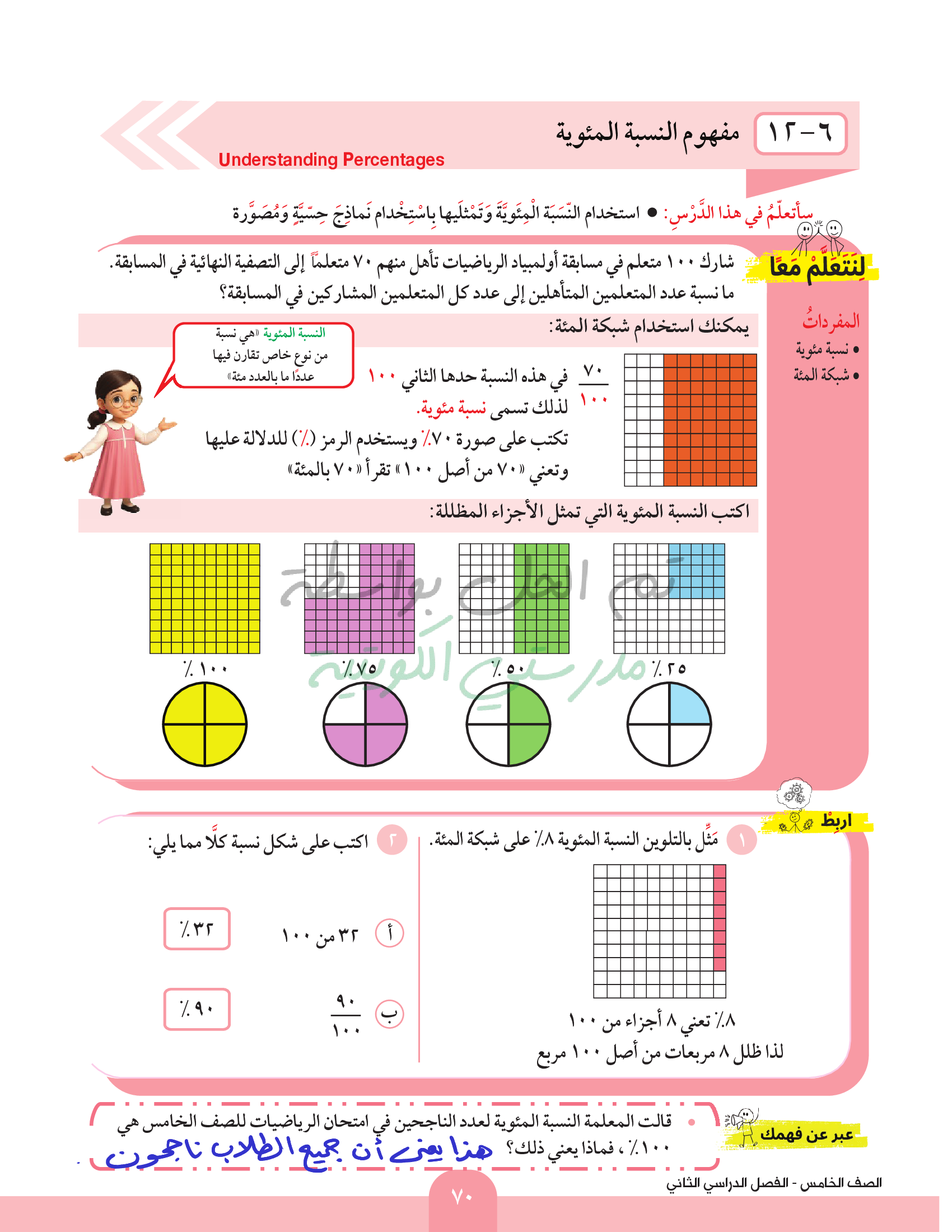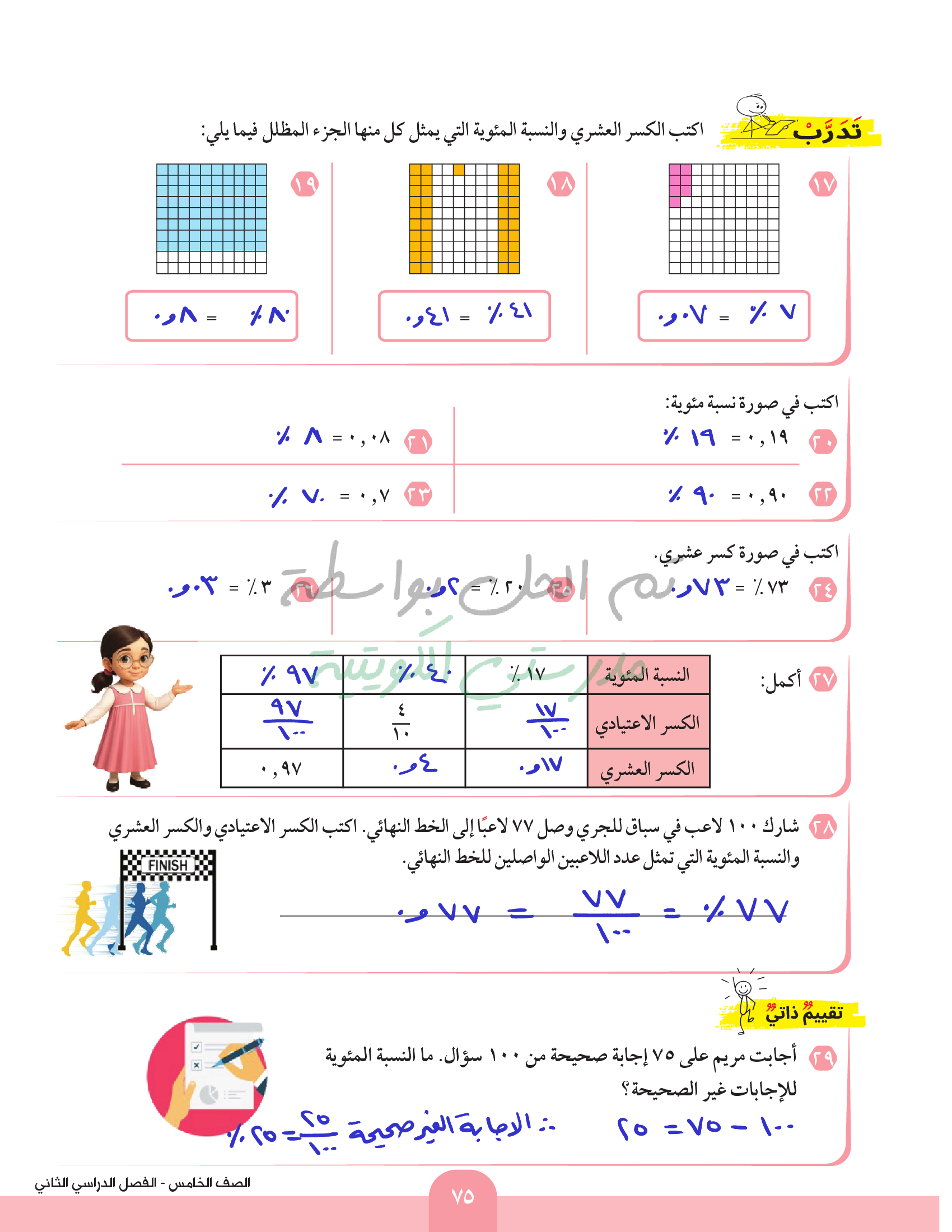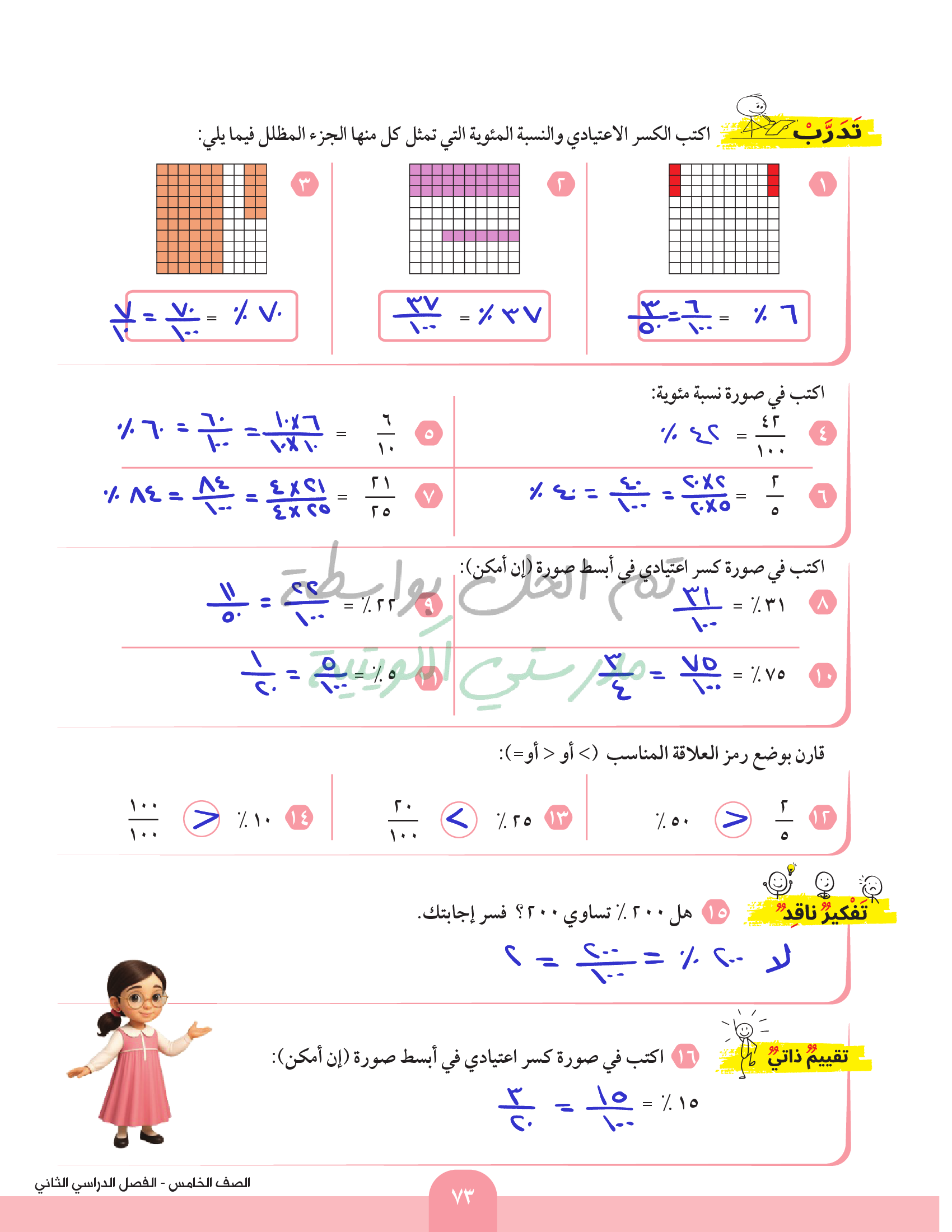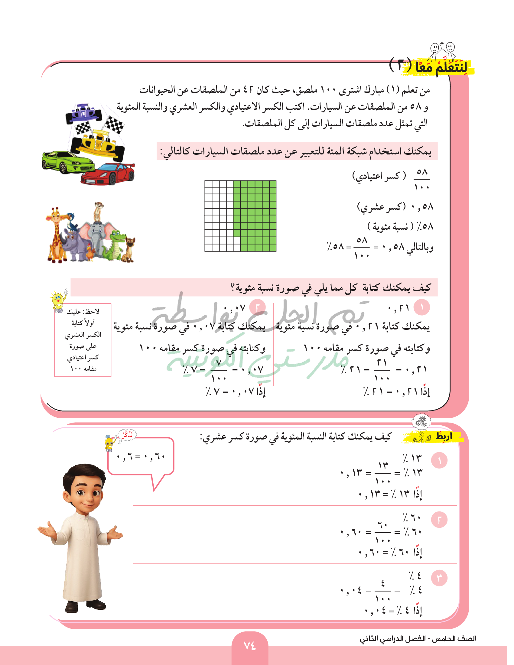 الربط بين الكسور الاعتيادية والكسور العشرية والنسب المئوية
