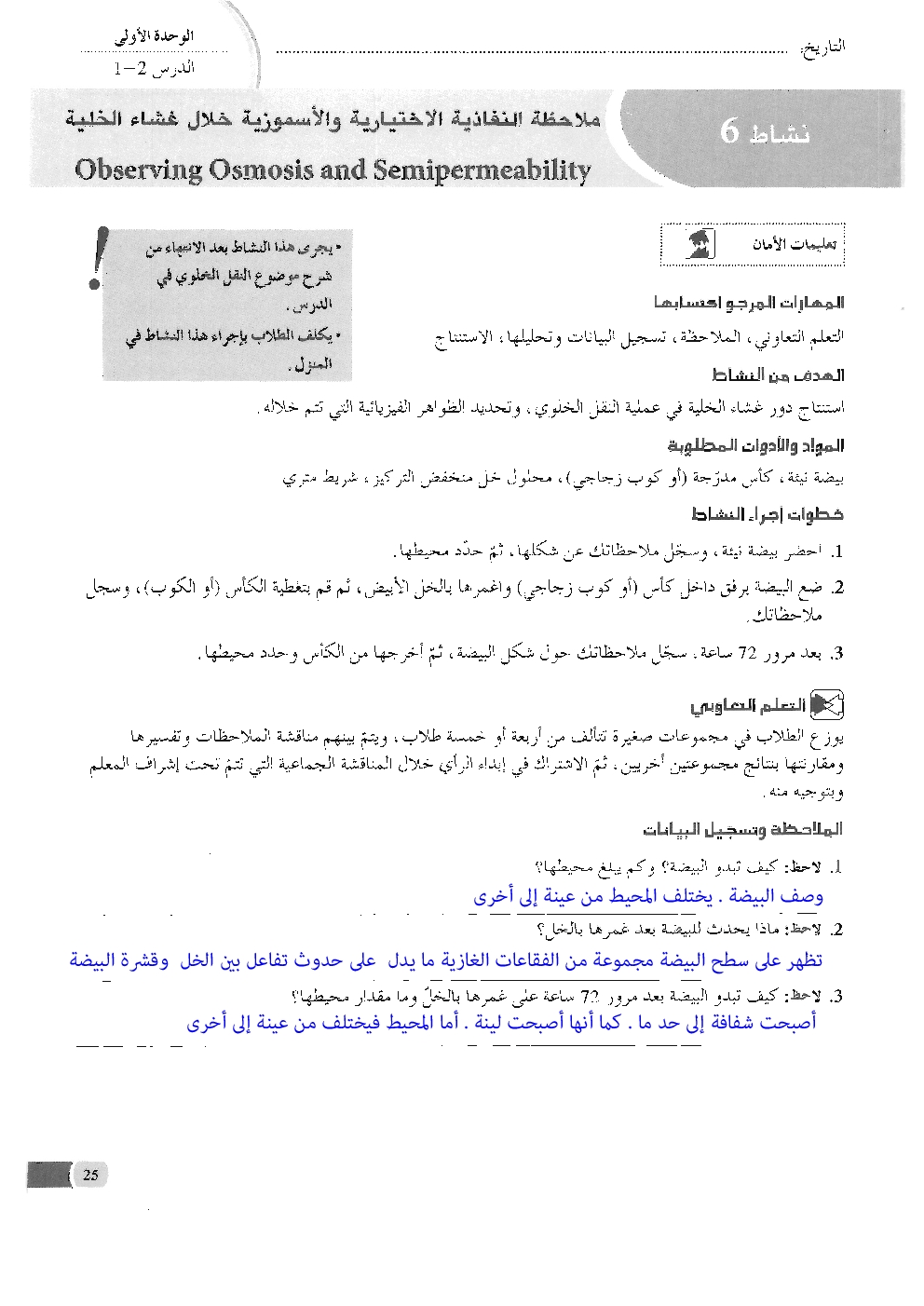 ملاحظة النفاذية الاختيارية والاسموزية خلال غشاء الخلية
