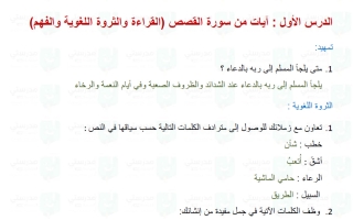 حل درس آيات من سورة القصص لغة عربية الصف السابع
