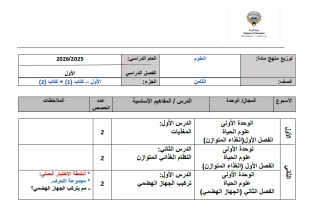 توزيع منهج علوم الصف الثامن الفصل الأول 2025-2026