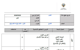 توزيع منهج علوم الصف التاسع الفصل الأول 2025-2026