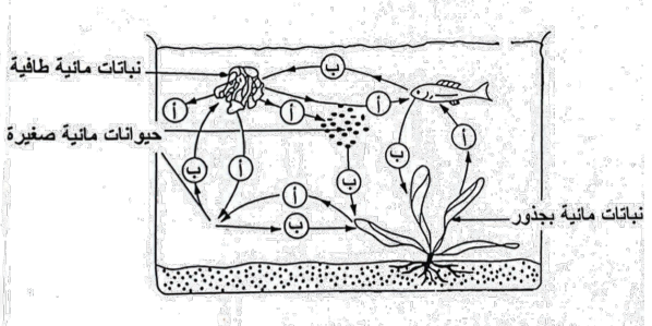 يوضح الشكل الذي أمامك مثالا للعلاقة بين الكائنات البحرية. وخلال النهار فالكائنات البحرية إما تستهلك أو تعطي (أ) أو (ب) والموضحة بالأسهم، البدائل الصحيحة ل (أ) أو (ب)هي