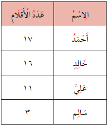 في الجدول المقابل يوضح عدد الأقلام لمجموعة من المتعلمين. اذكر أسماء ٣ متعلمين مجموع أقلامهم يساوي ٣٠ قلمًا؟