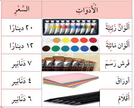 أراد والد شريفة أن يرسم لوحات جميلة خلال نزهته في البر فاشترى من المكتبة ٣ أدوات ب ٣١ دينارًا هل يمكنك أن تخمن ماذا اشترى؟