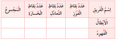 فَي بُِطَولَْةٍِ دَوْرٍِيِ كُرَِةُِ الْْقَدَِمُِ يََحَْصُْلُِ الْْفََرِيَقُِ عَلِّى ٣ نَِقاطٍُ فَي حِالِِ الْْفََوْزُِ، وَنَُقْطََةٍٍ واحِِدَِةٍُ فَي حِالِِ الْتََعادُلِِ، وَلْاِ يََحَْصُْلُِ عَلِّى نَِقاطٍُ فَي حِالِِ الْْخَْسْارٍَةُِ. كانََتِْ نََتَائِِجَُ فََرِيَقِِ الْْأ بِْطَالِِ: ٥ فََوْزٍُ، ٣ تَِعادُلٍِ ، ٣ خََسْارٍَةٍُ ، وَنََتَائِِجَُ فََرِيَقِِ الْْفَُهْودِ: ٣ فََوْزٍُ، ٧ تَِعادُلٍِ، خََسْارٍَةٌُ واحِِدَِةٌُ ماهو الفريق الذي حصل على أكبر عدد من النقاط؟